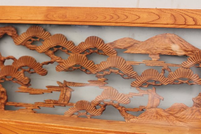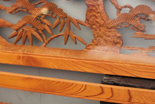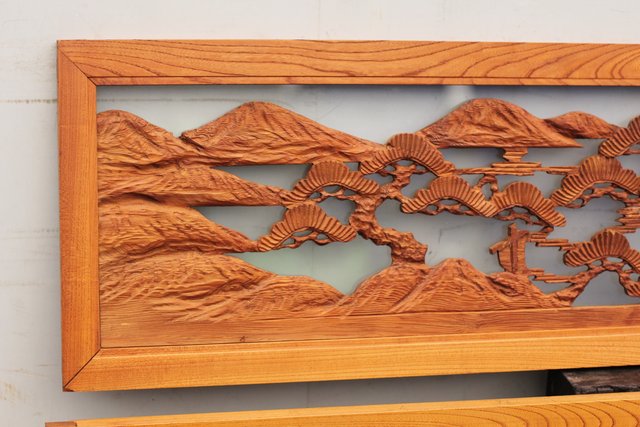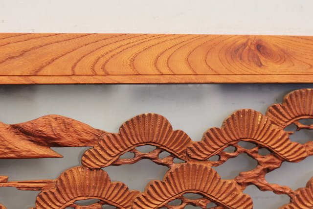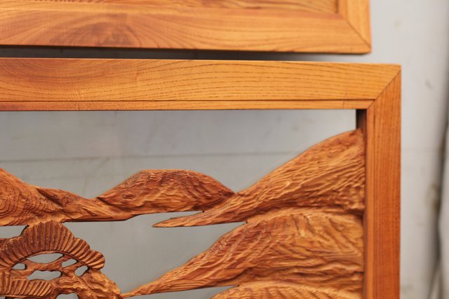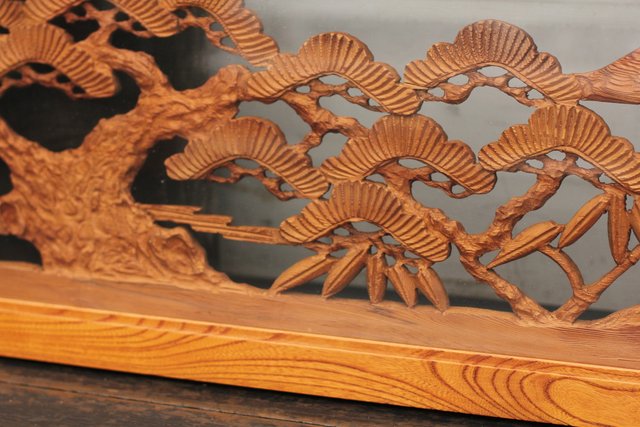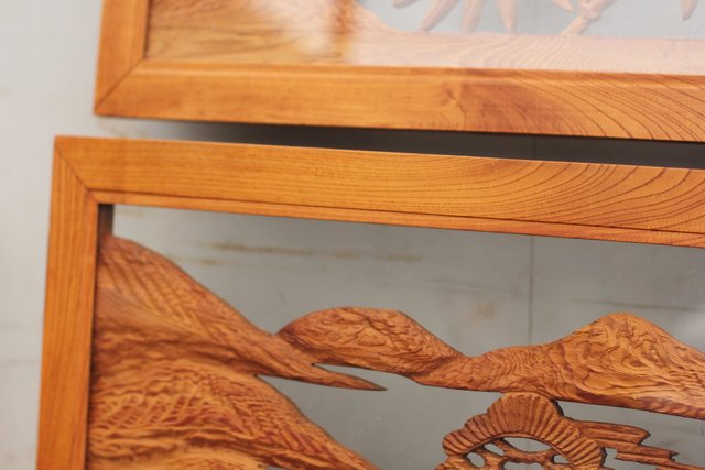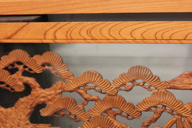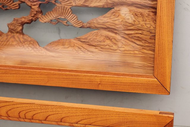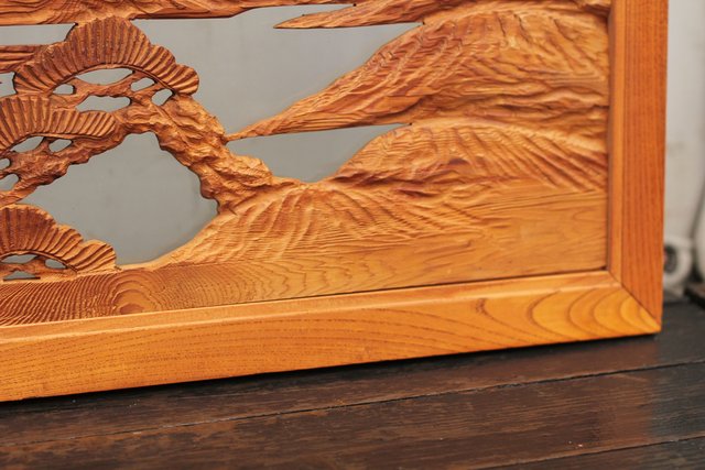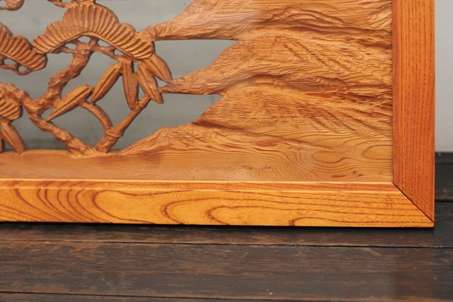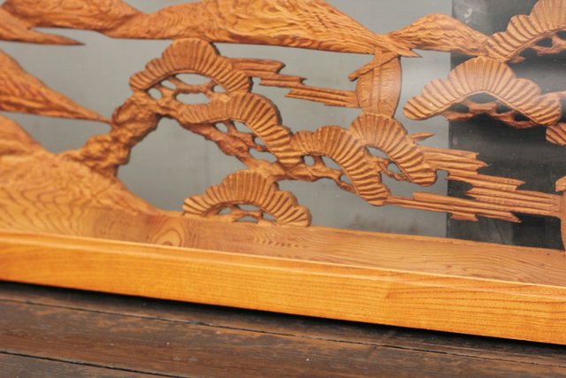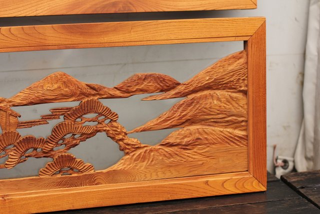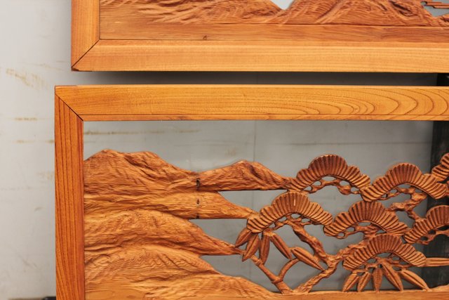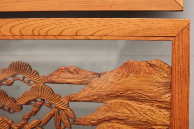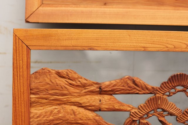 硝子入欅枠の木彫欄間 2枚1組 R1390