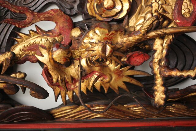 寺院彫刻金彩木彫欄間 龍 R0372 あふれ出る波や龍