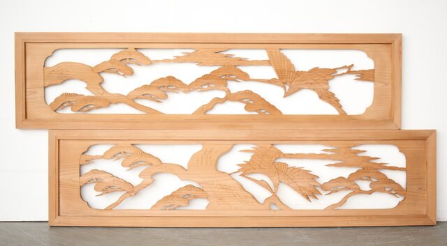 中型 鶴松木彫欄間 2枚1組 R0387