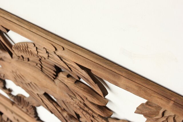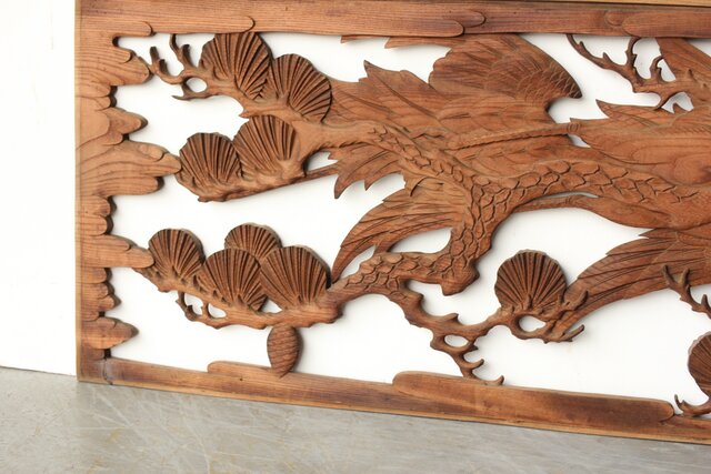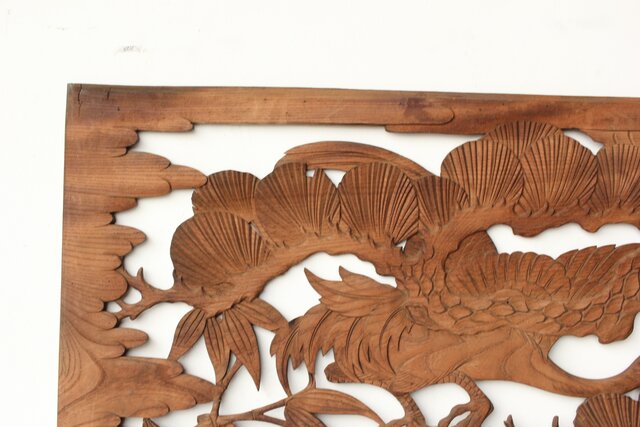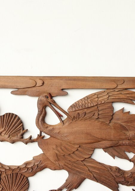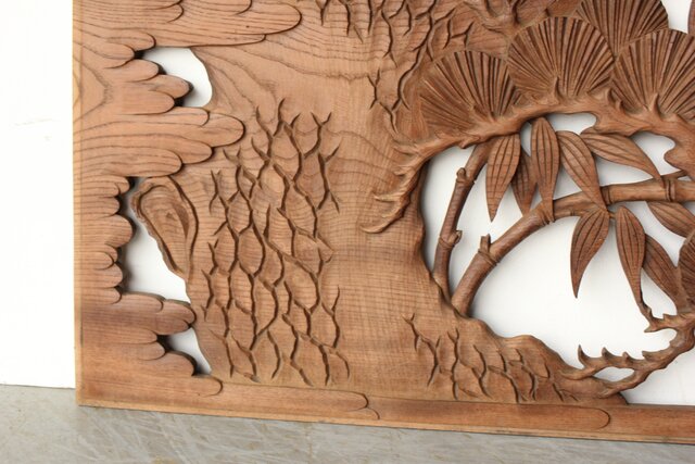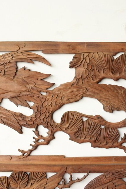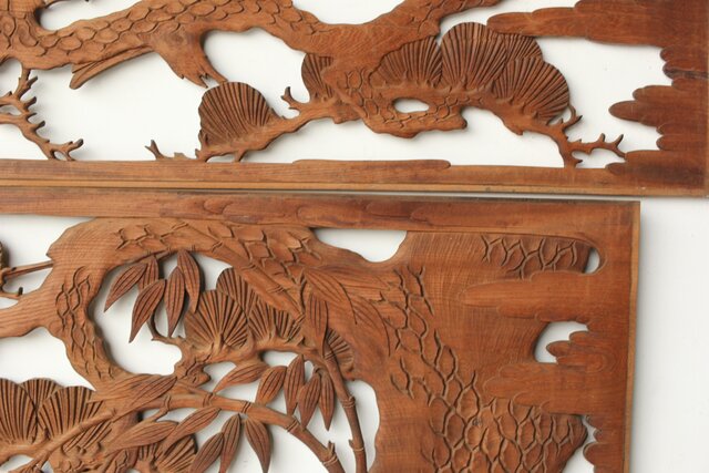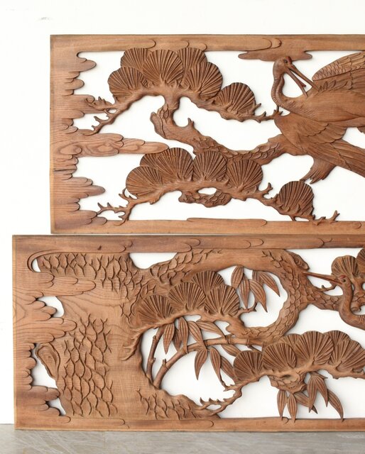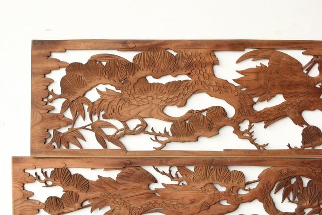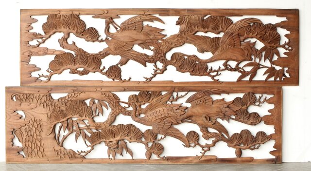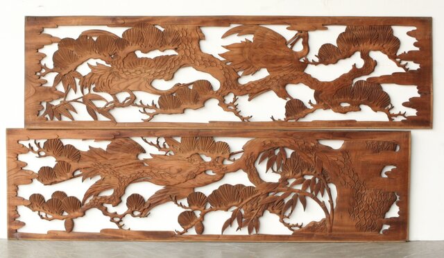 枠無 鶴松竹 堅木木彫欄間 2枚1組 R0445