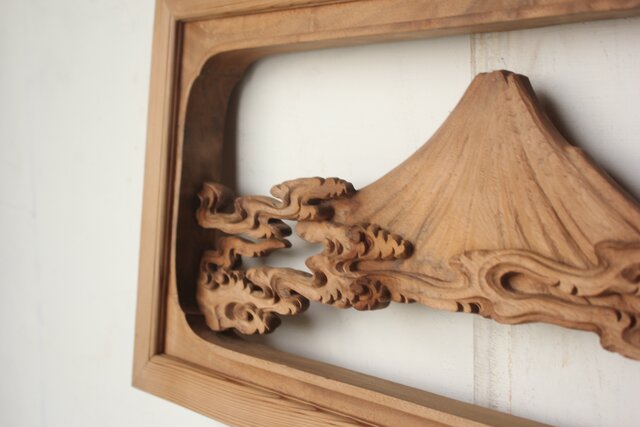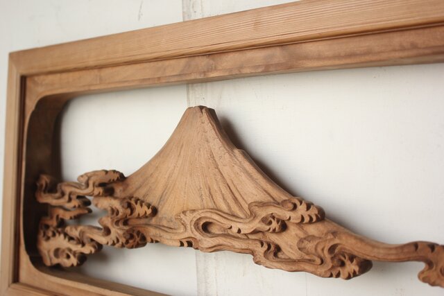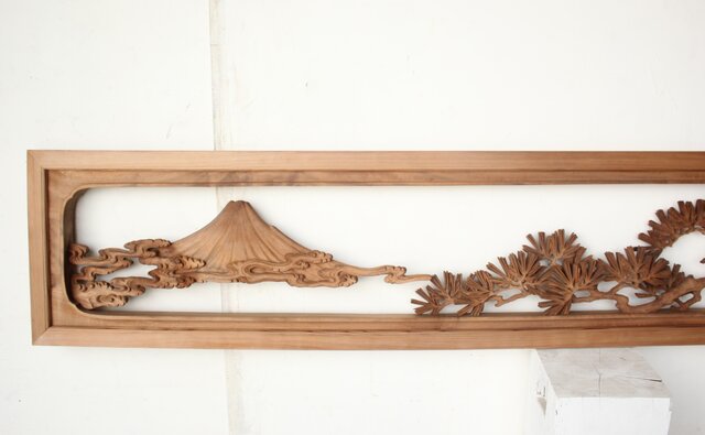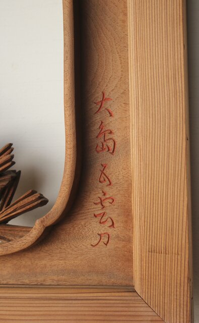 大島五雲 井波彫刻 木彫欄間 【富士に松】 R0508 赤い銘は二度目 何か意味があるのでしょうか