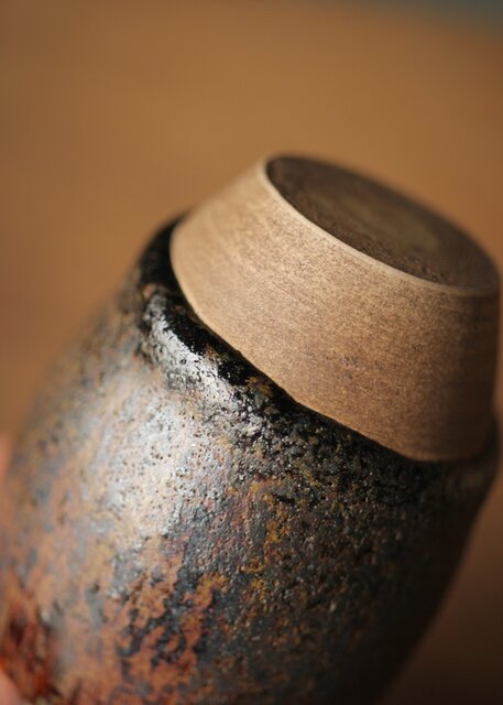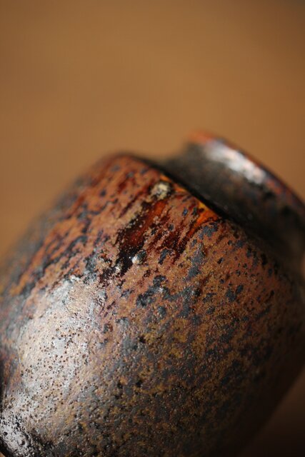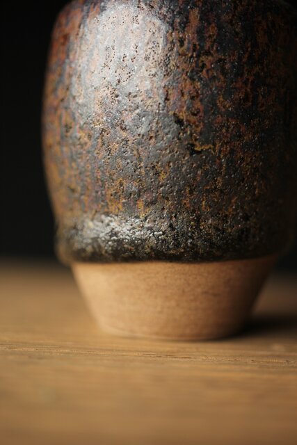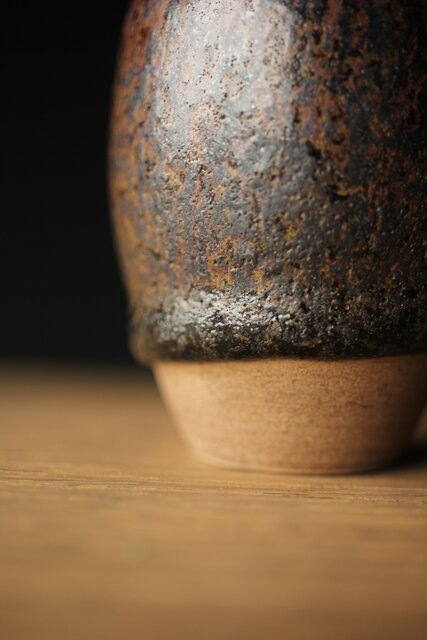 下の方にたまった黒い釉薬と白い土との対比が景色となります