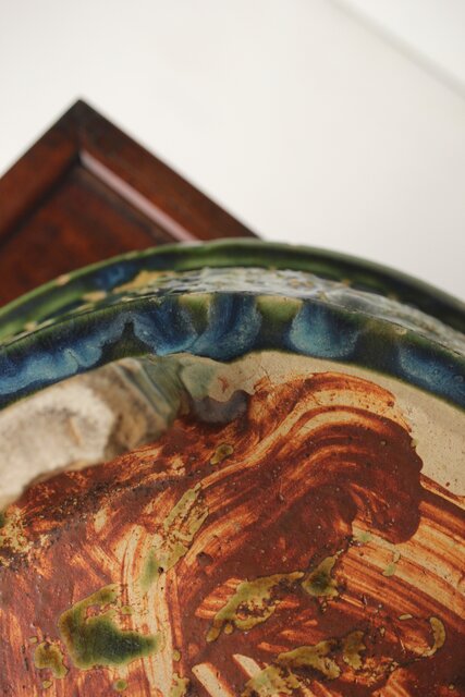 織部のような釉薬 青い発色も素敵です