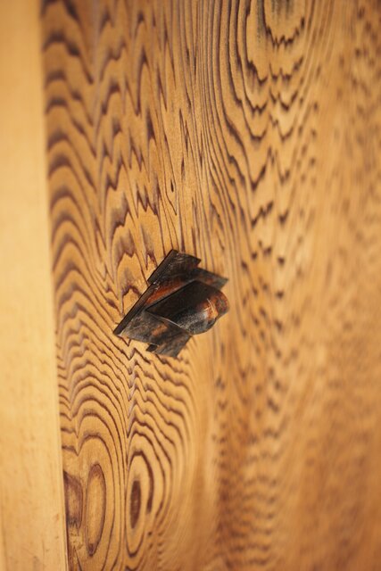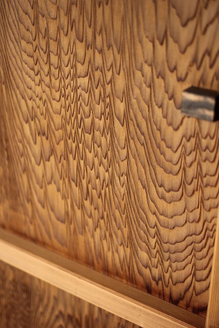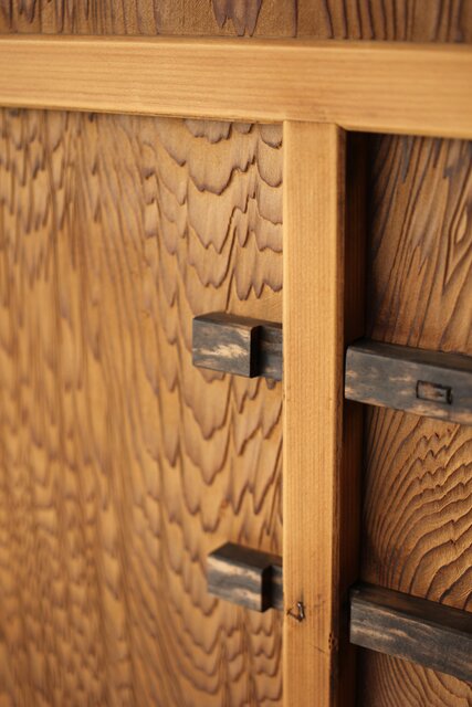 引手/カンヌキにもこだわりが見え 孔雀杢系の美しい黒柿材を使用しています