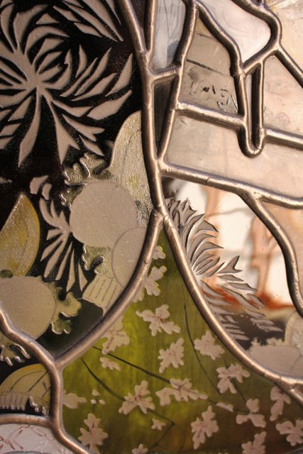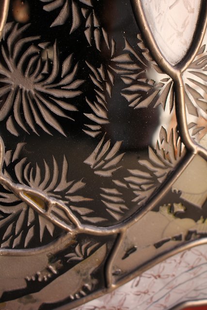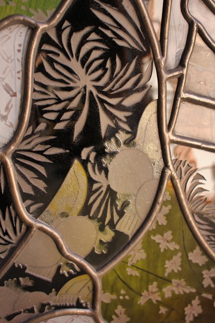 複雑な曲線カットや絵付け サンドブラストもしくは腐食による切子ガラスのような表現