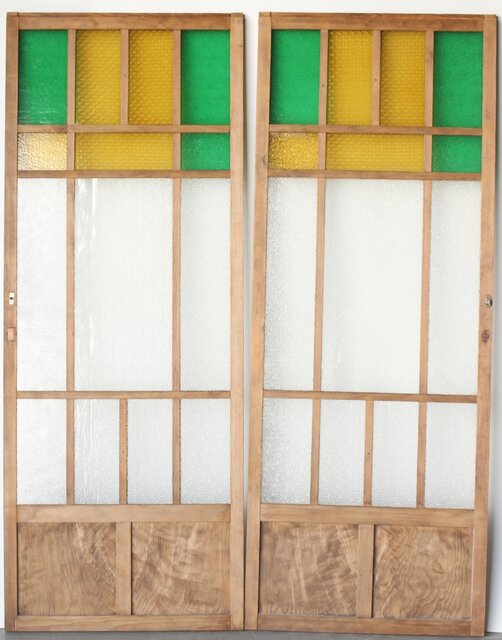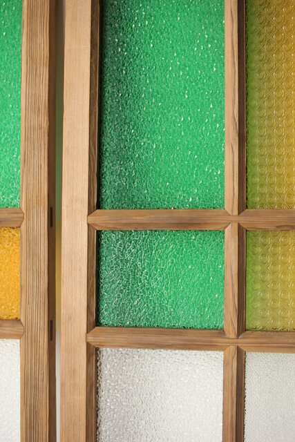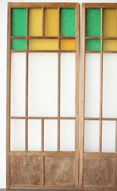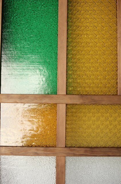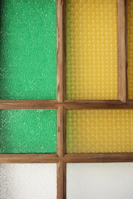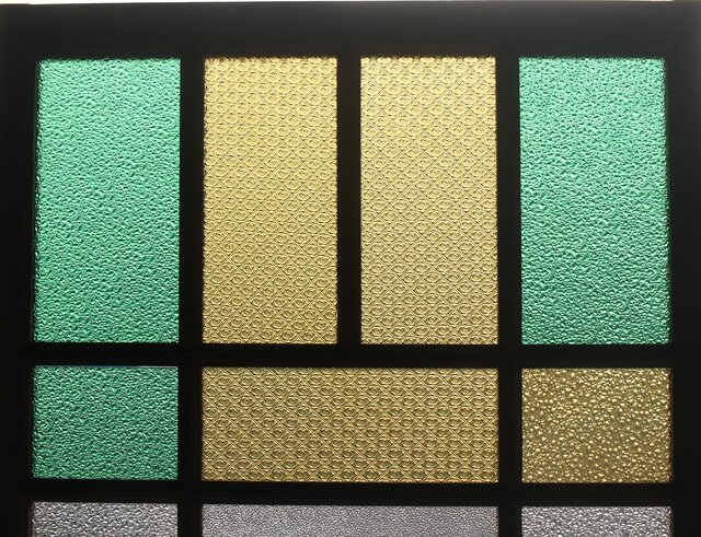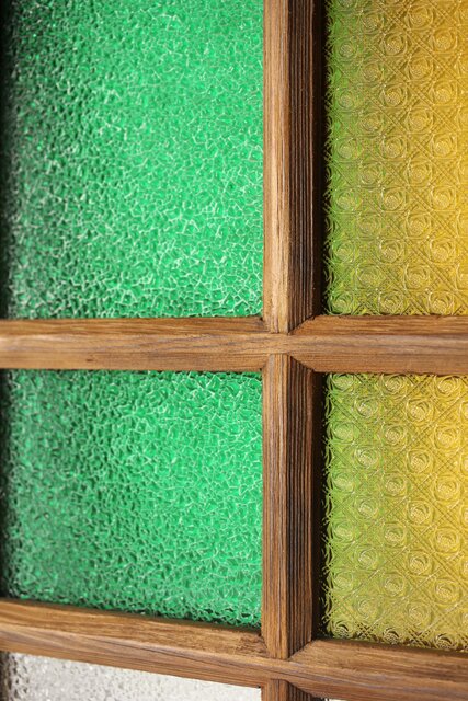 緑色ガラスと黄色の色ガラスがアクセントとなった手の込んだガラス建具です