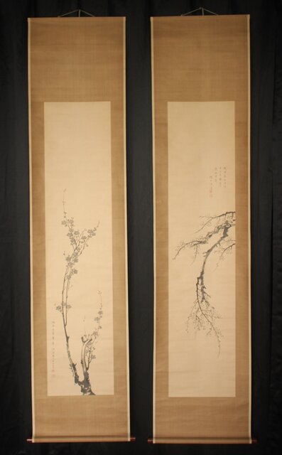 倣 中林竹洞 王元章筆意 墨梅図 紙本掛軸 対幅 Z936