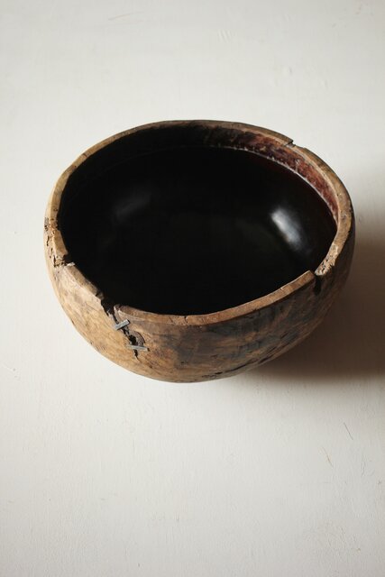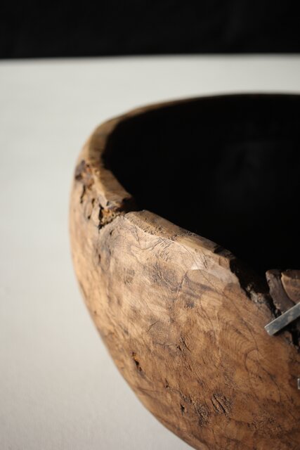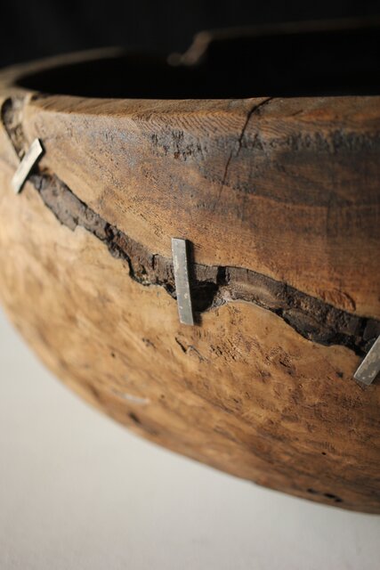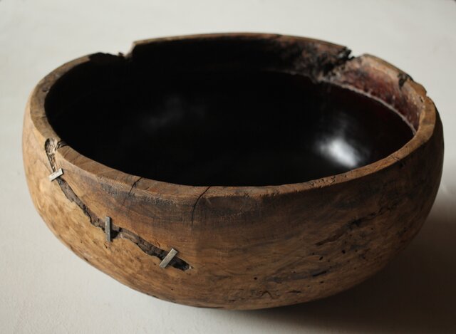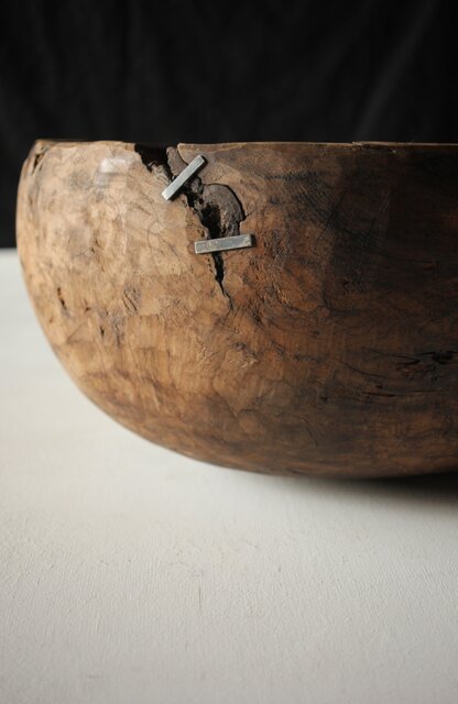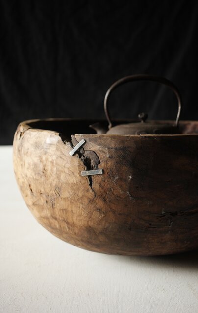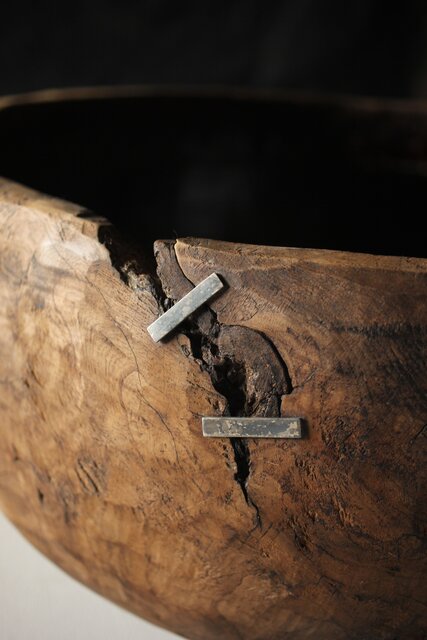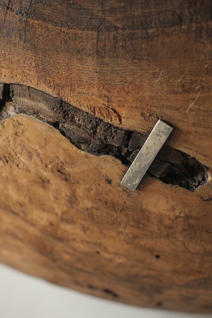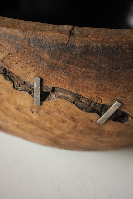 美しい古材の割れなどを美とし 銀のカスガイなどで化粧