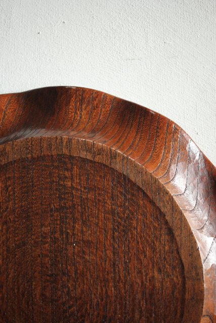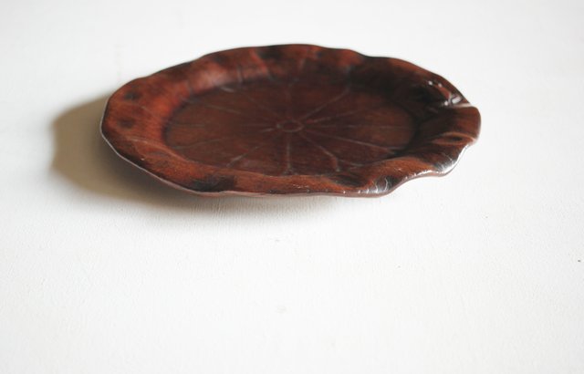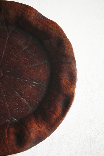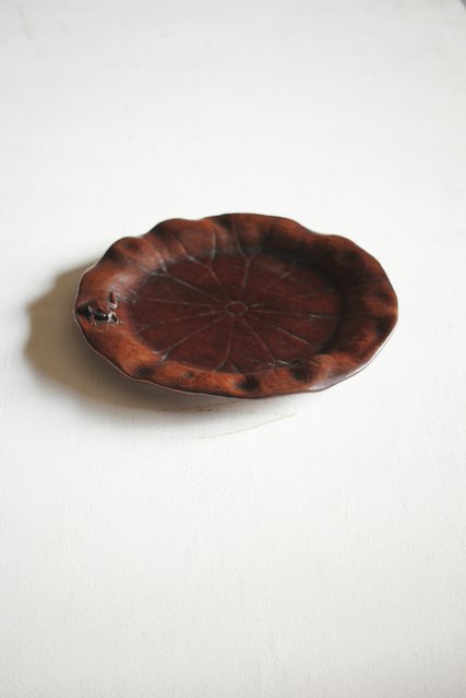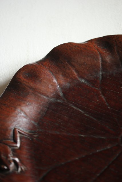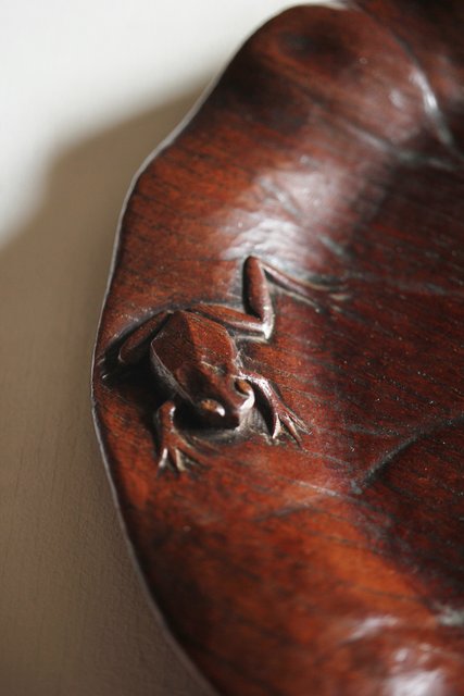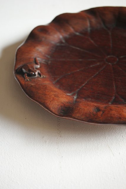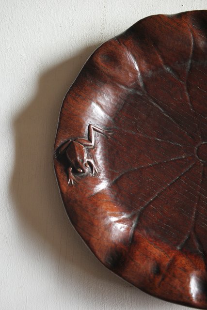 蓮葉に蛙 在銘木彫盆 X217