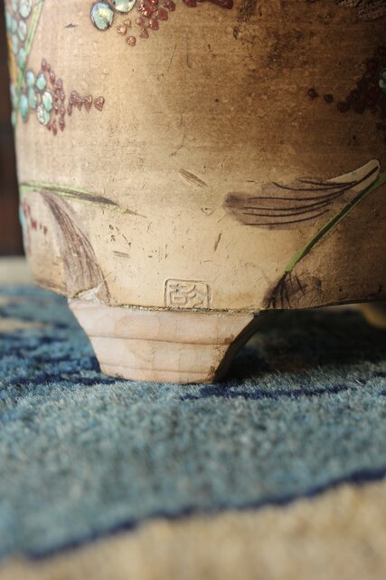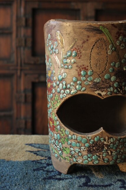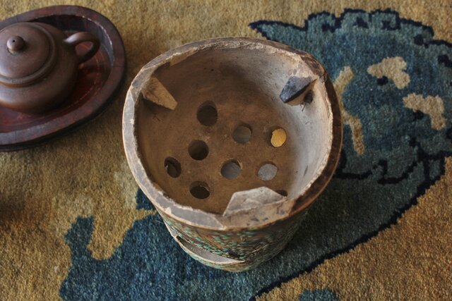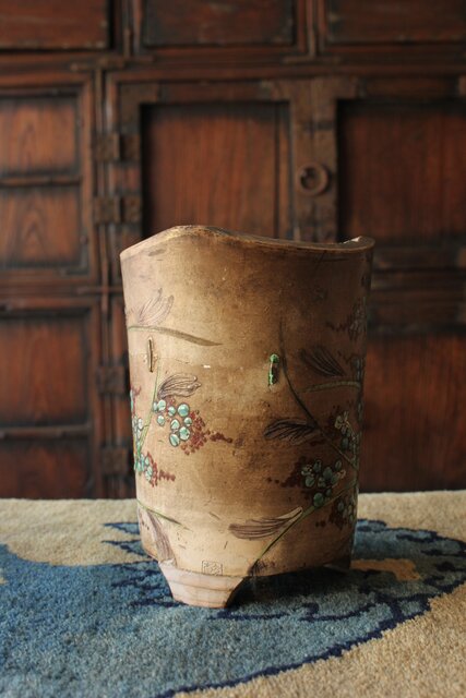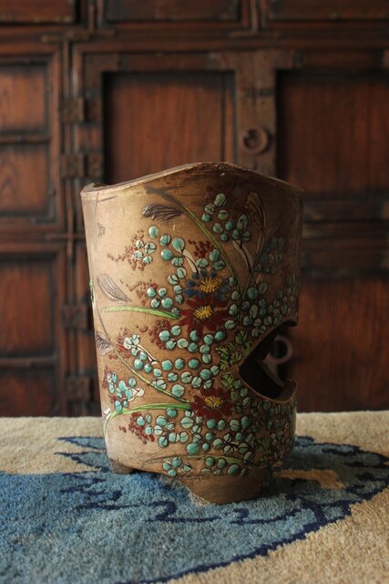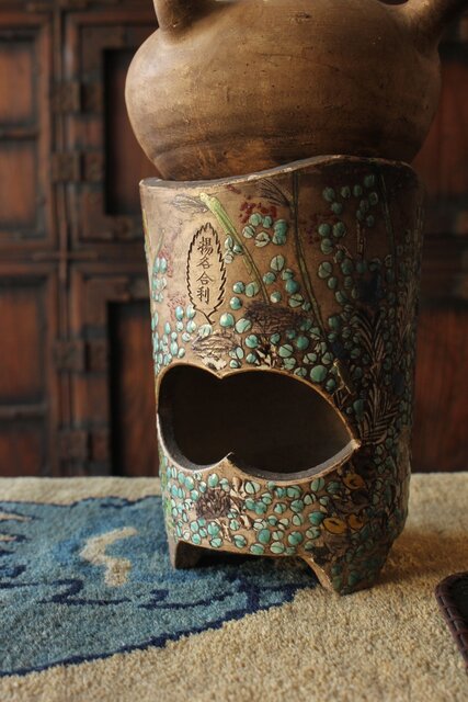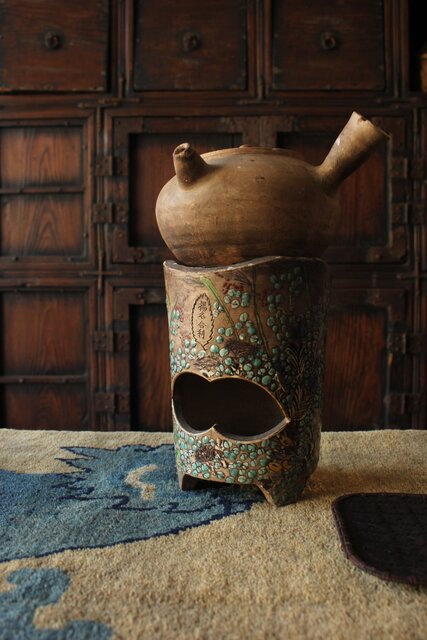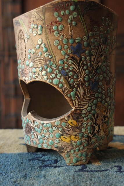 「揚名合利」の銘を入れた 音羽屋惣太郎 乾亭による秋草を描いた感覚の良い白泥の涼炉
