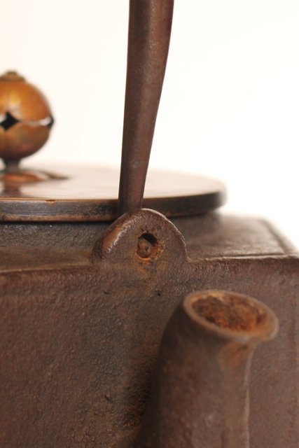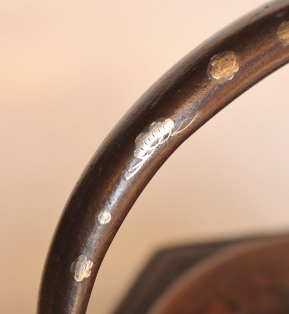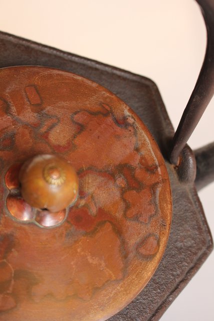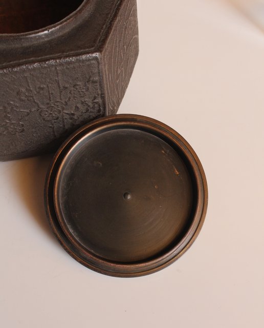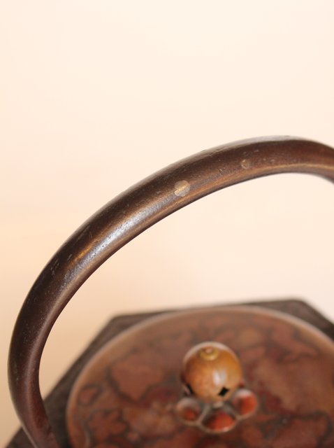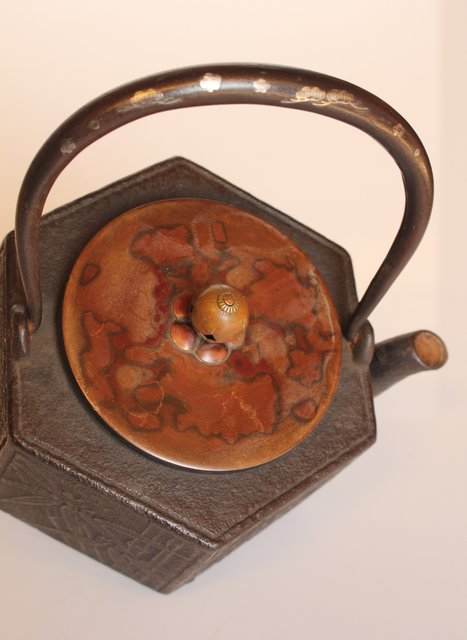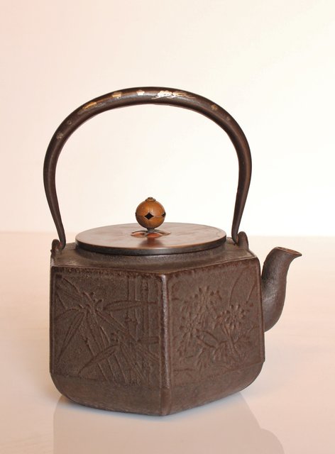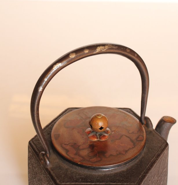 堤手銀象嵌 斑柴銅蓋菊蘭竹梅 釜師系六角鉄瓶 H456