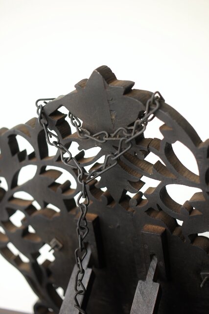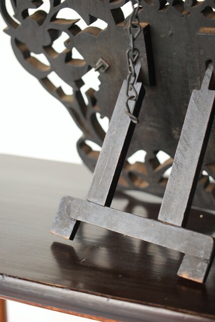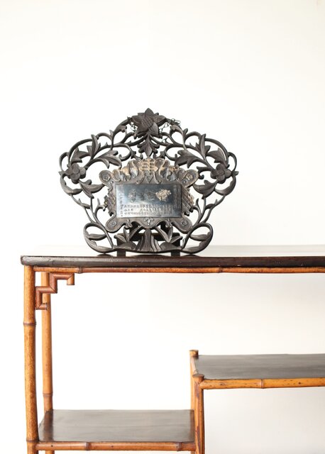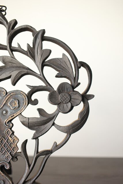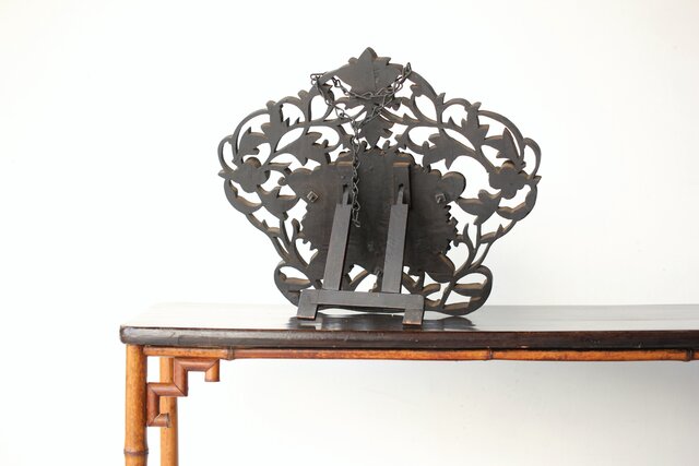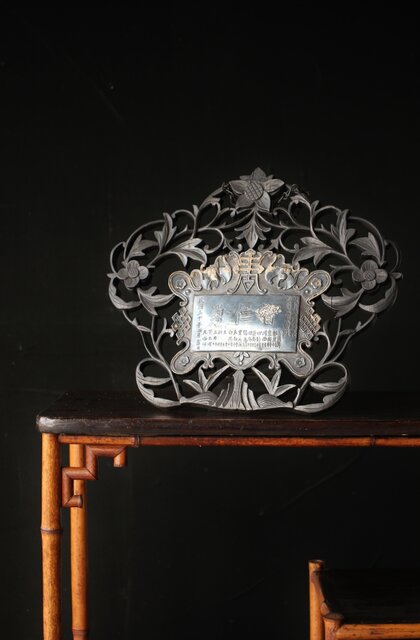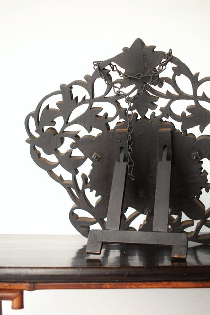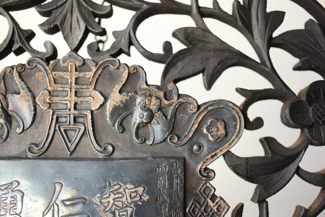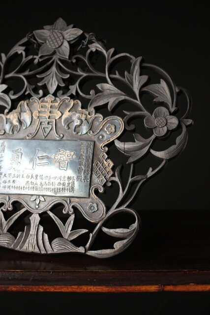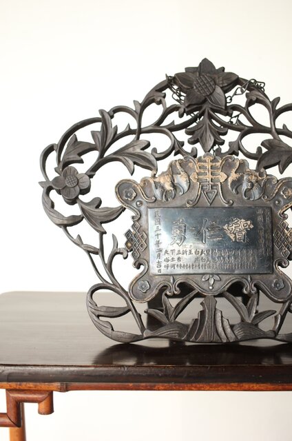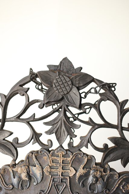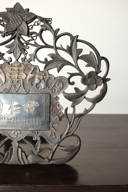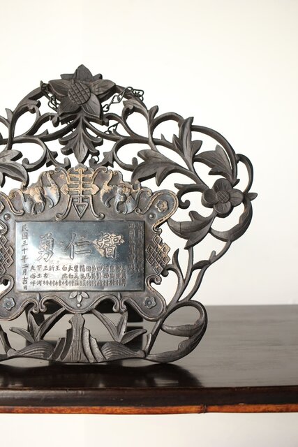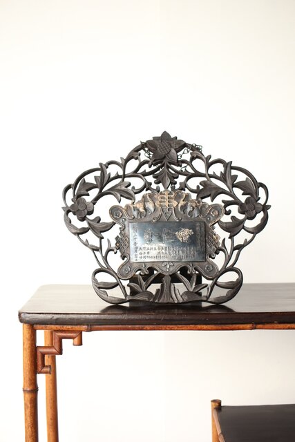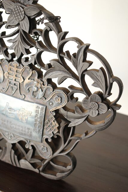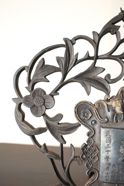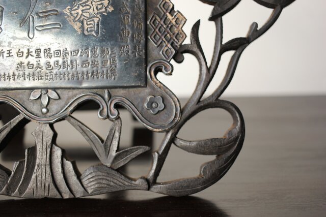 木彫の立派な装飾に取り付けてある盾には足銀製とあります
