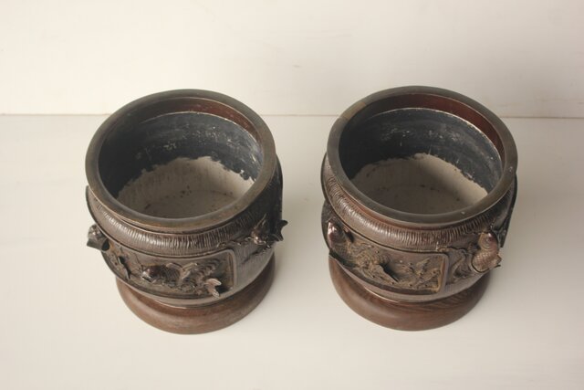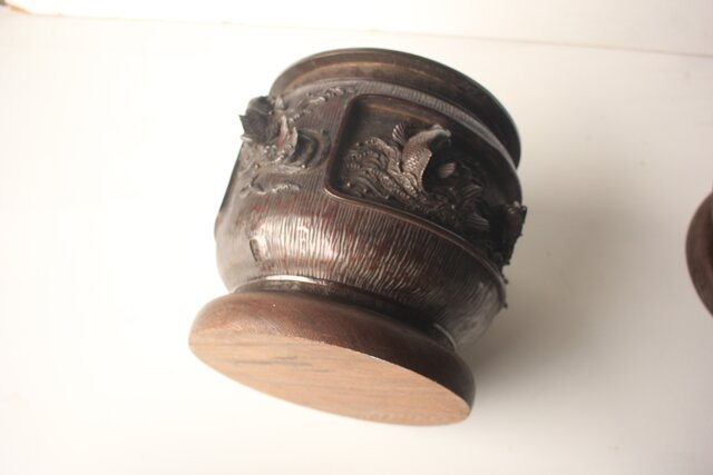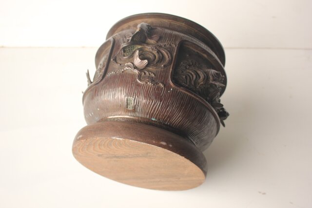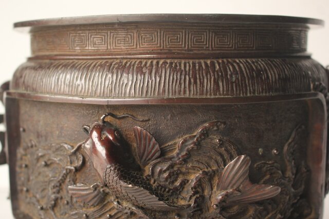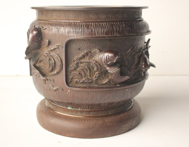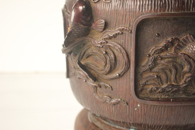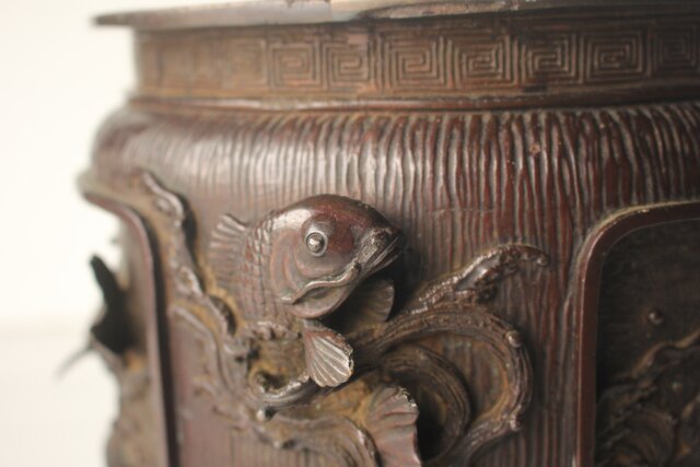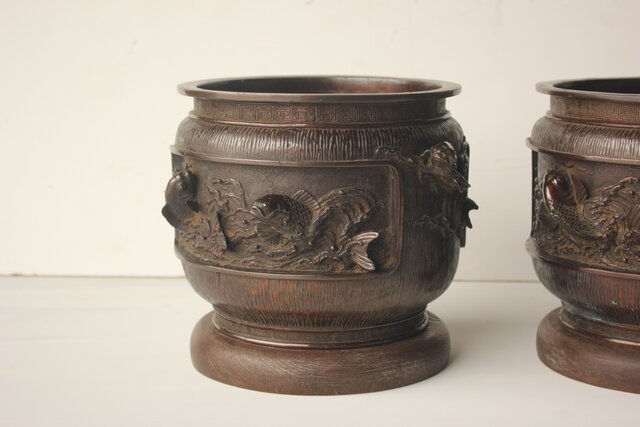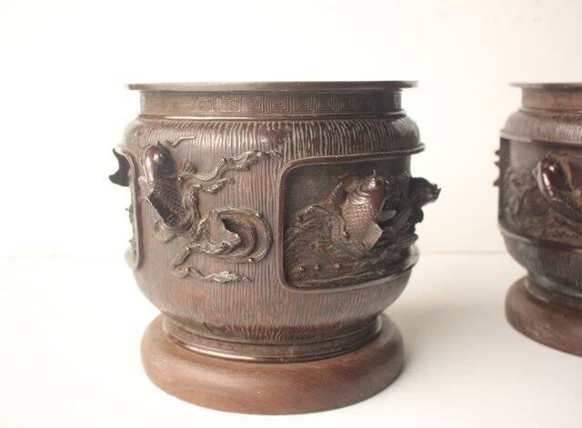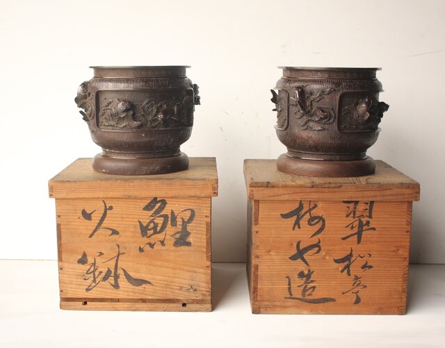 翠松亭梅や造 鋳造 鯉 銅火鉢一対 M493