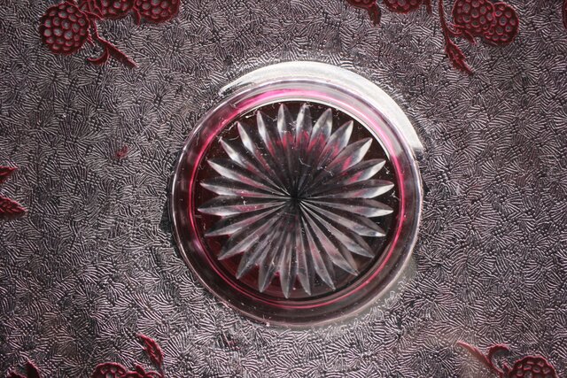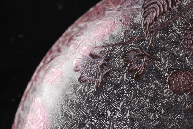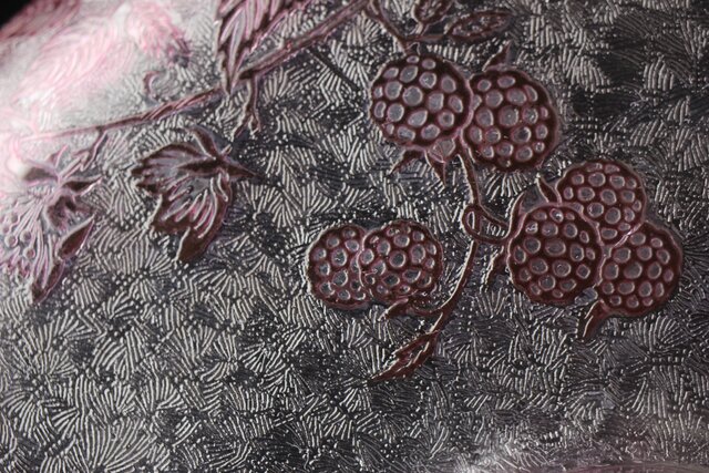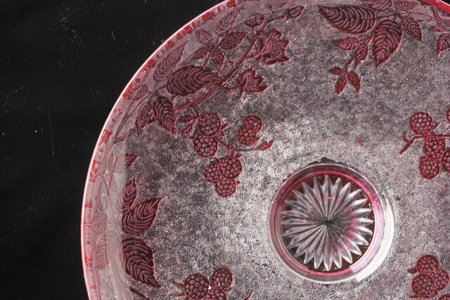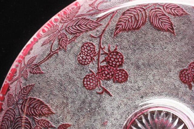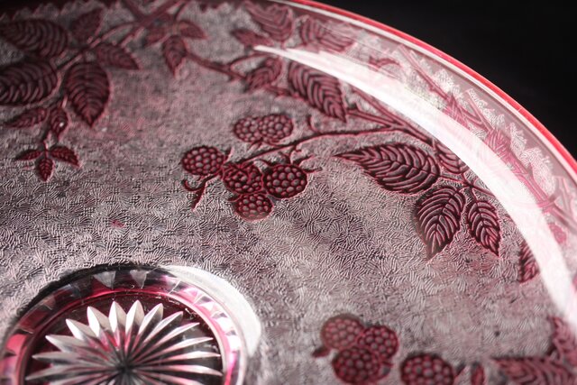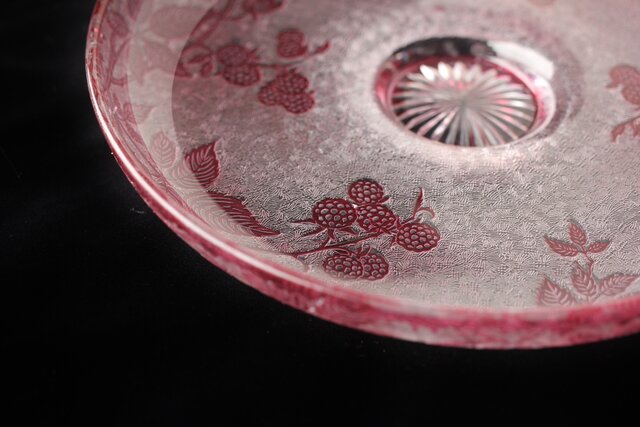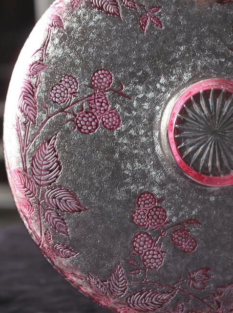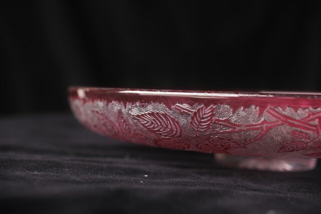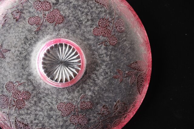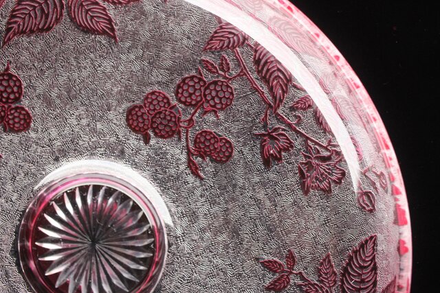 色被せクリスタルに模様を浮き彫り さらに透明ガラス部にはエッチングにより地紋様が刻まれるという