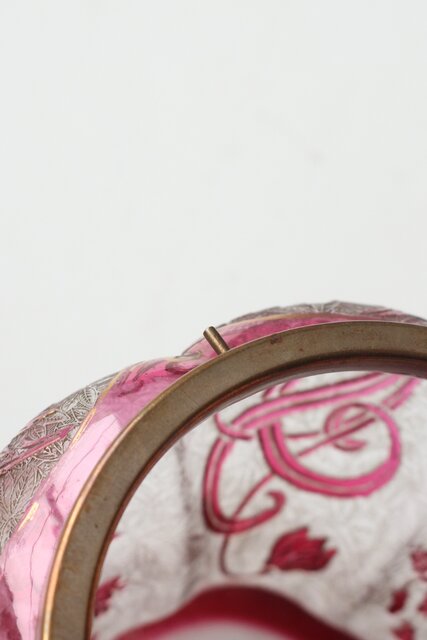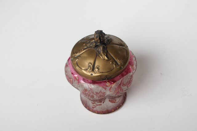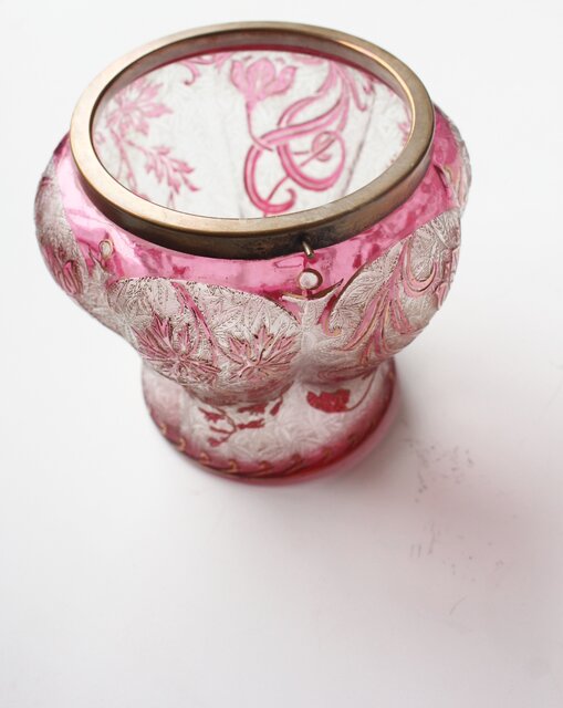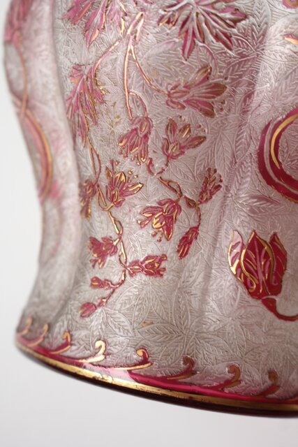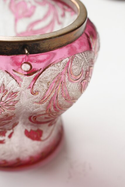 透明のクリスタルガラスに赤色のクリスタルを被せその赤色を残しつつ酸で腐食させて凹凸を付け細い針で模様を掘り込んでいくというとても手間のかかる技法だそうです