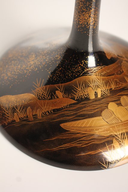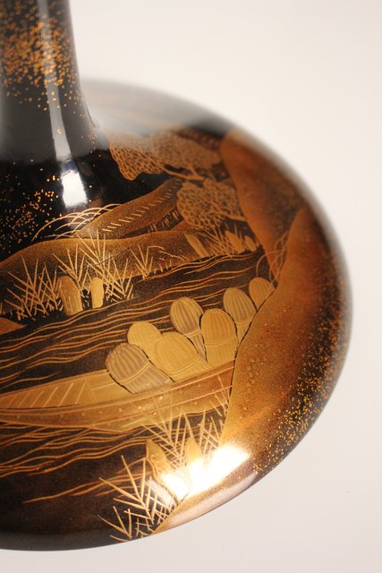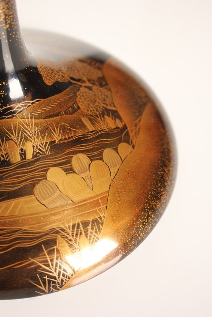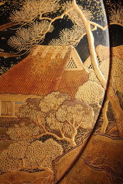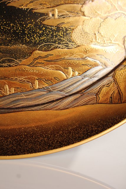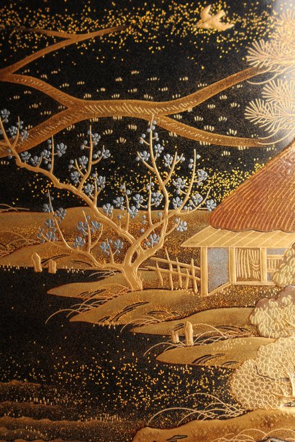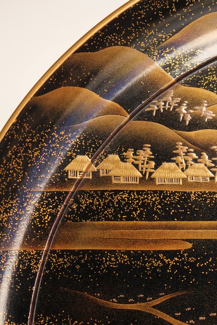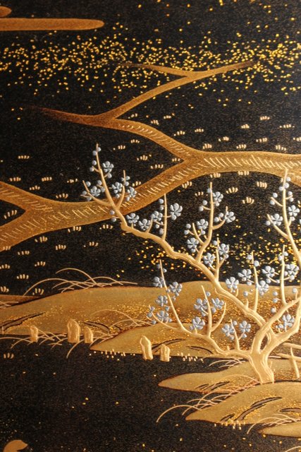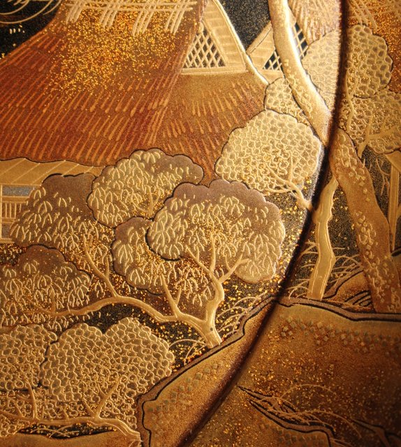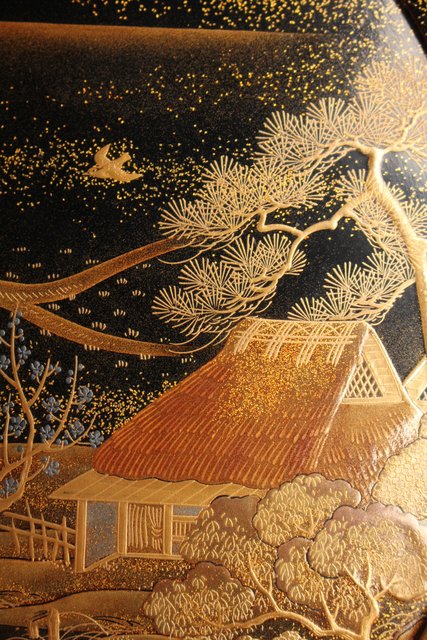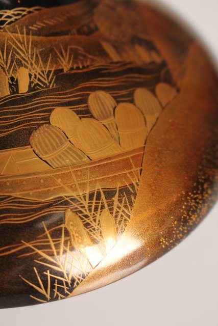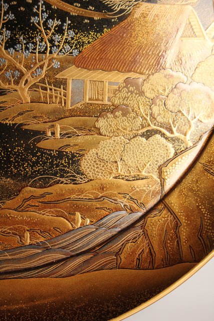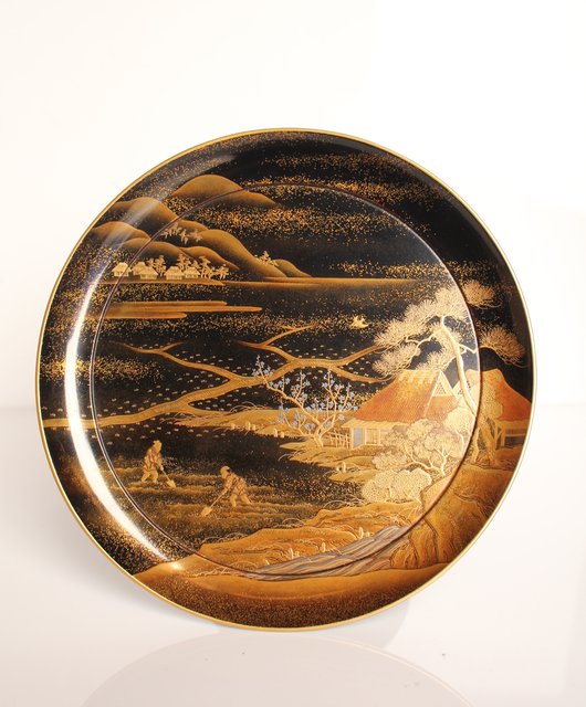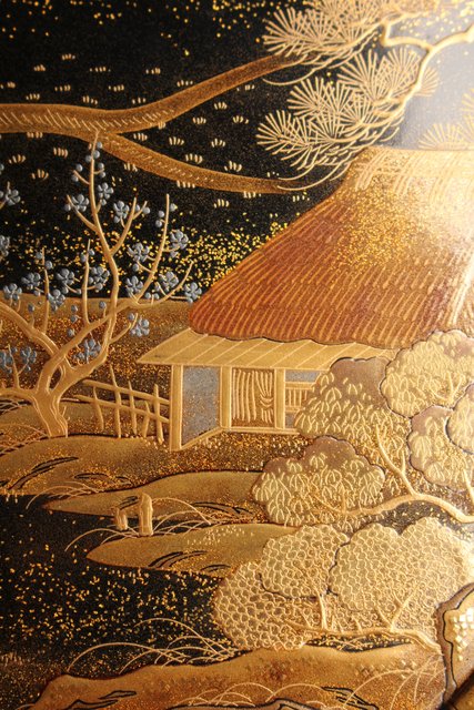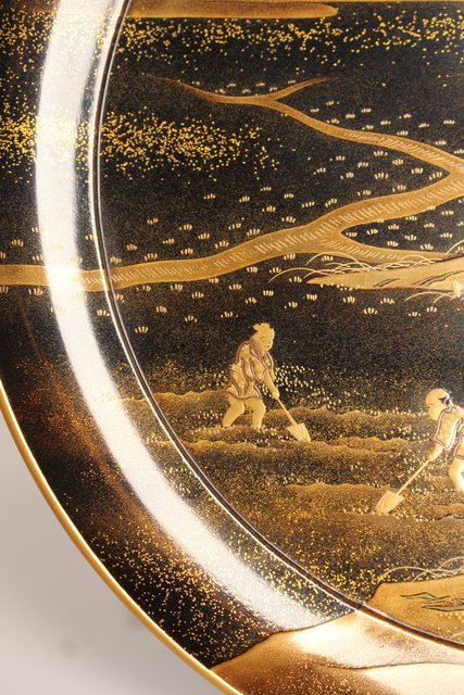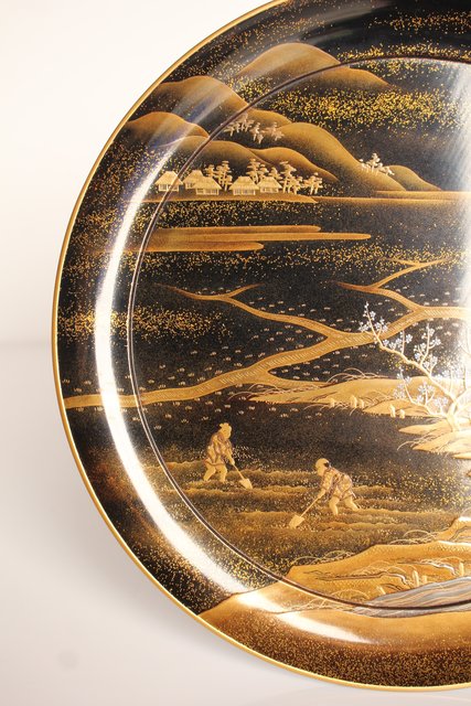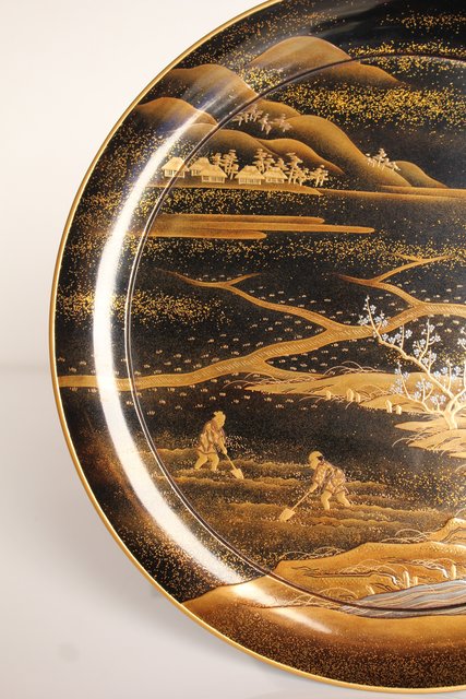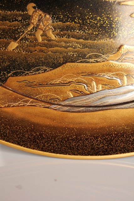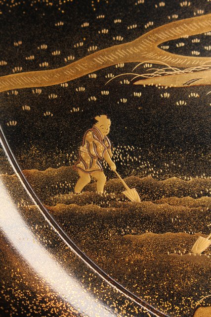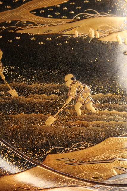 見事な研ぎ出し蒔絵で表現した耕作の図
