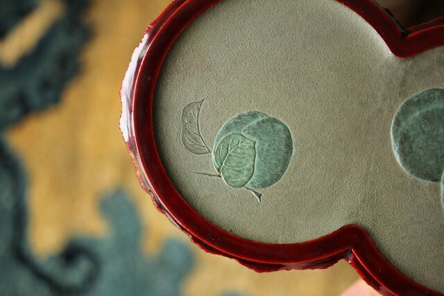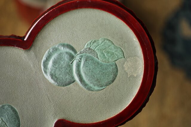菓子器:三日月型の上に家が描かれています 底面に花押