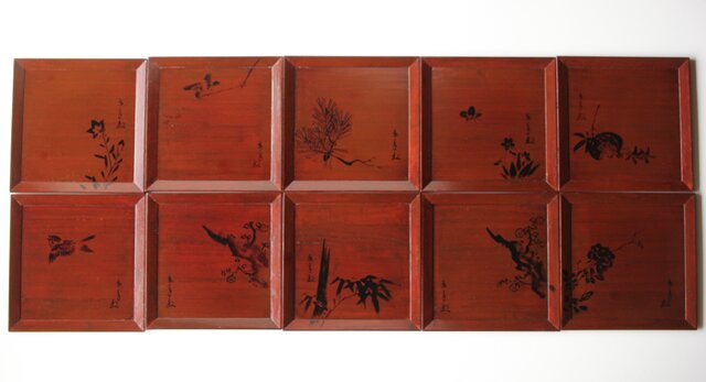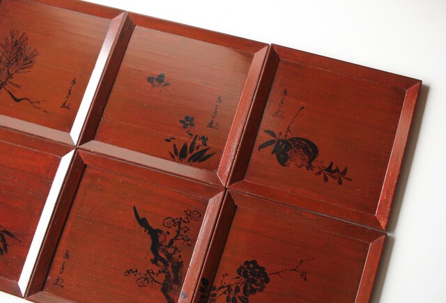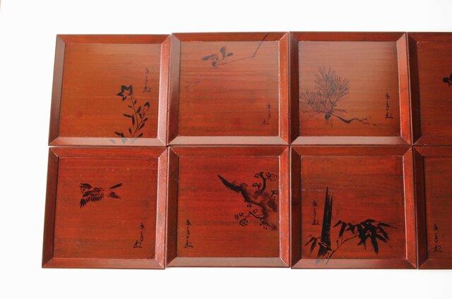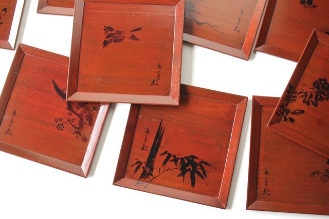平安象彦造 今尾景年画 図替 桐溜柿合四方盆十客 共箱 Q368