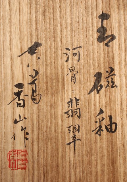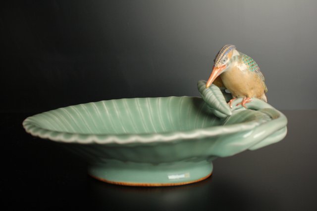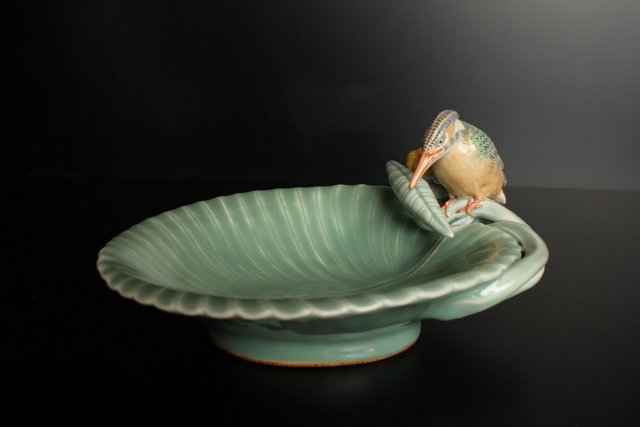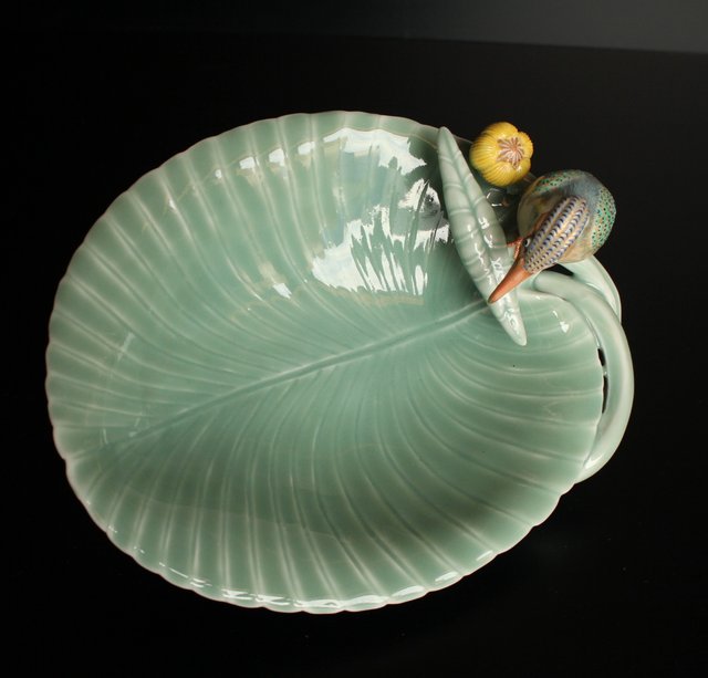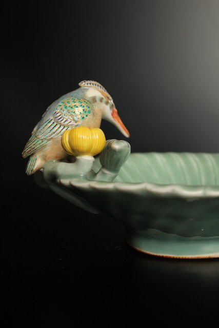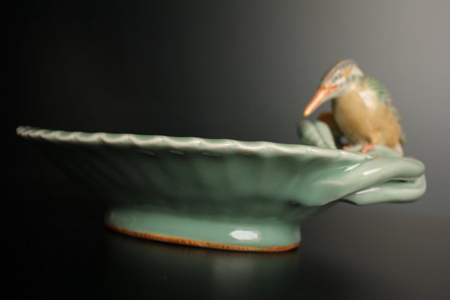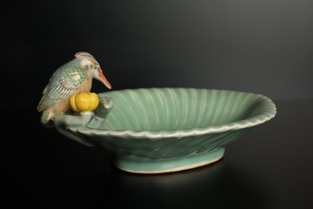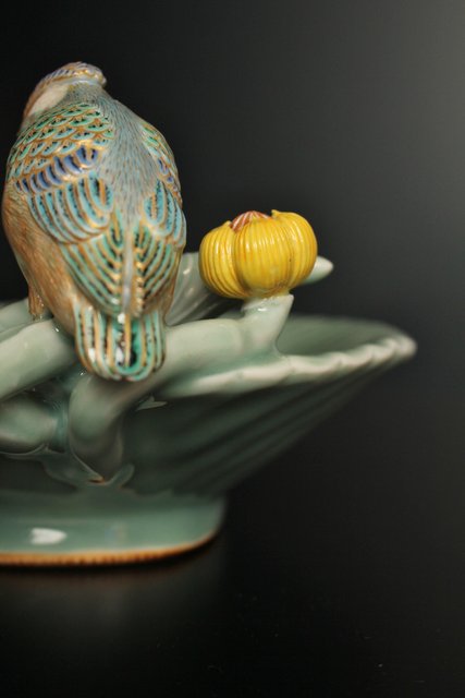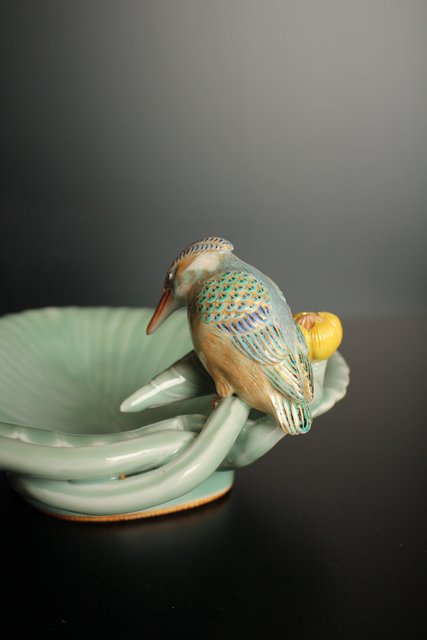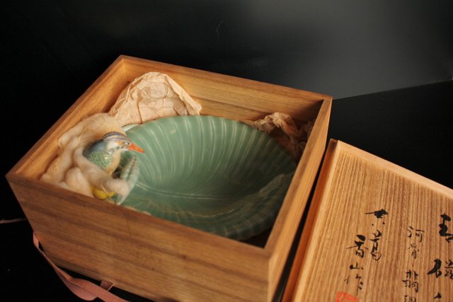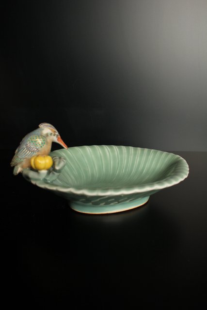 三代 真葛香山/宮川香山 青磁釉河骨二翡翠 菓子器 K402