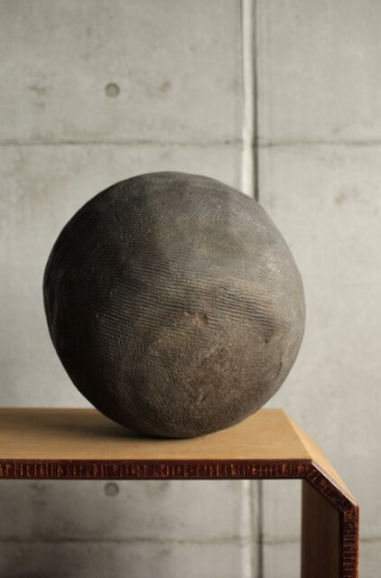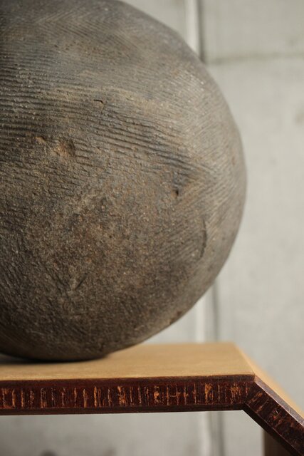 黒灰色の焼き上がりで 片側に自然釉が少しかかっていて景色になっています