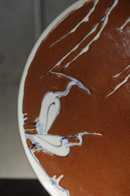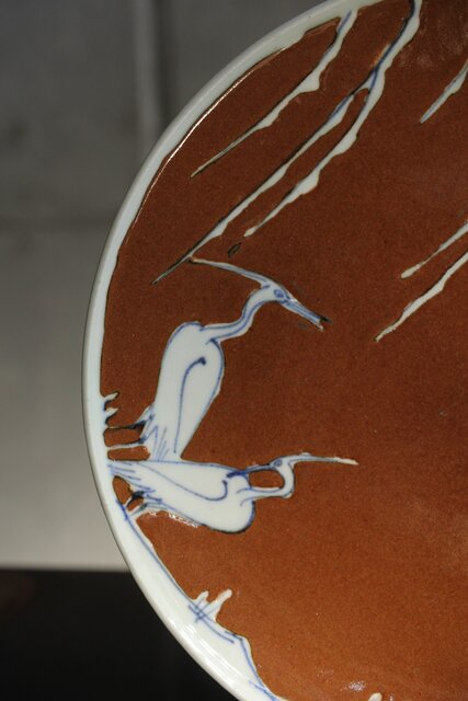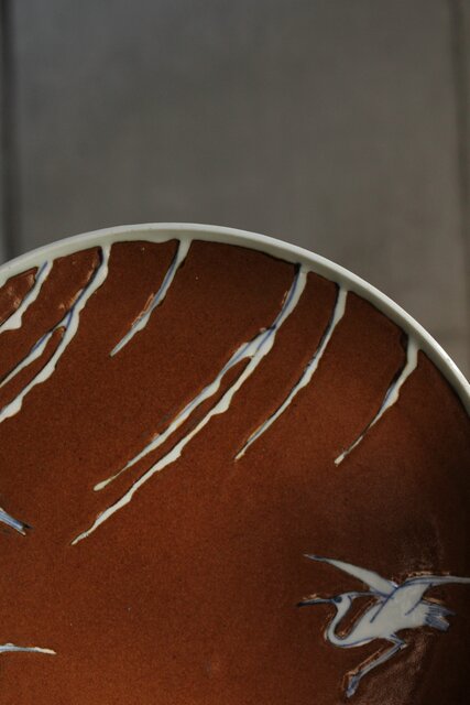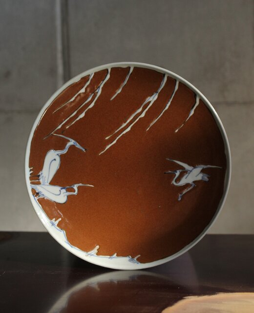 加藤土師萌 柿釉染付鷺文中皿 吸坂手 加藤絹子識箱 P543