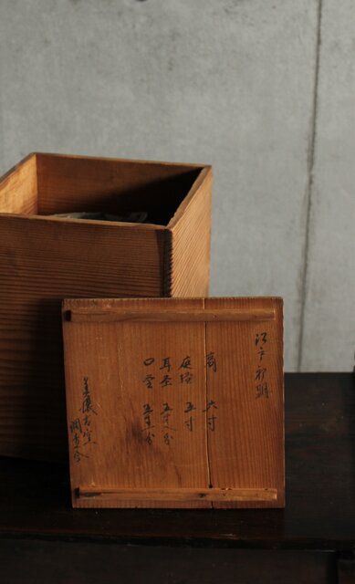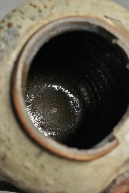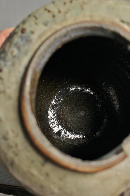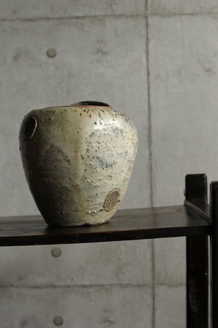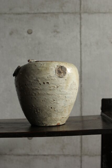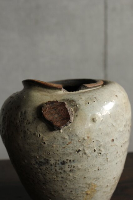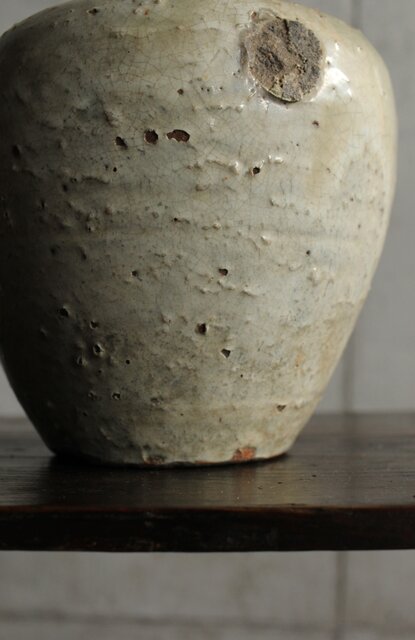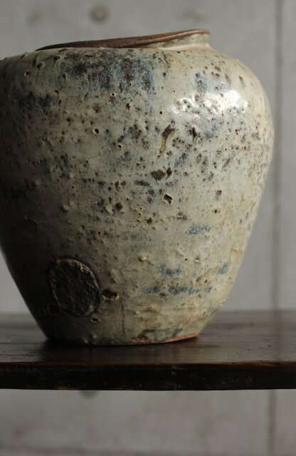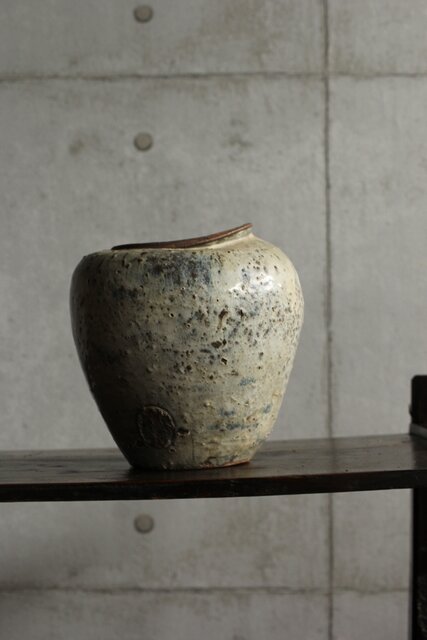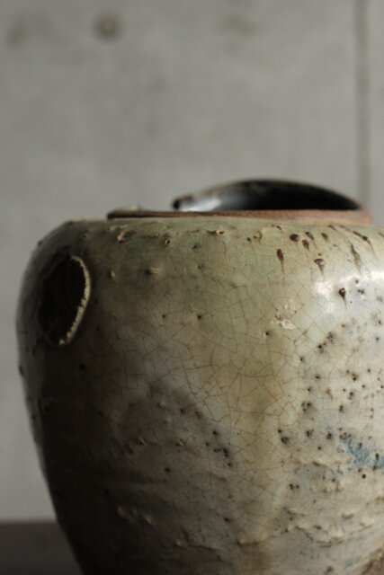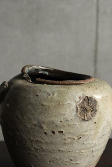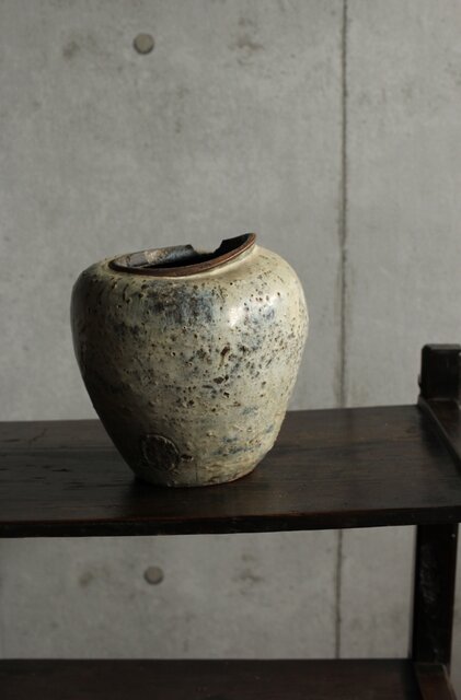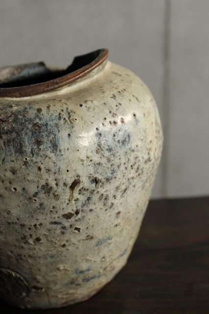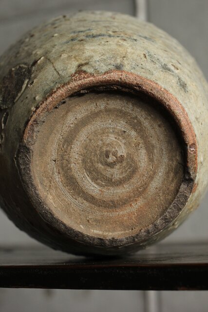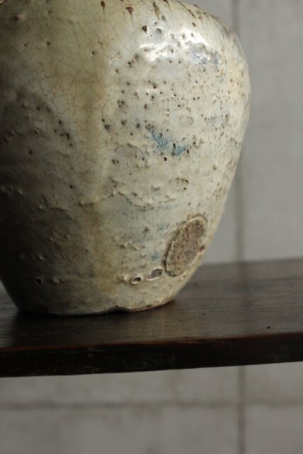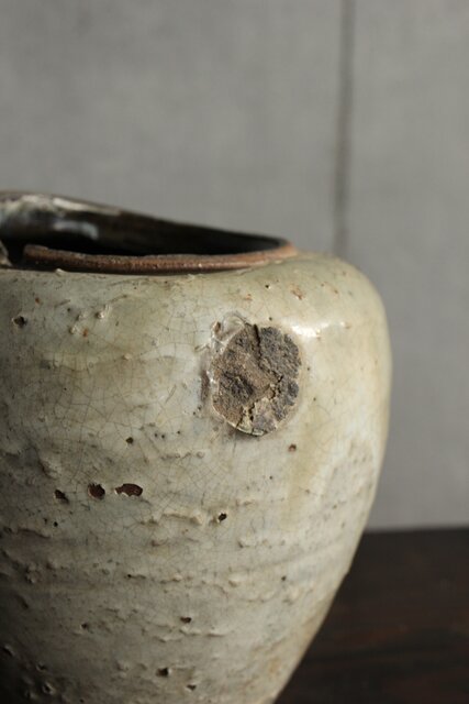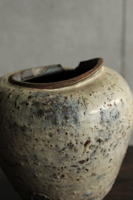 九州・唐津系でしょうか 藁灰釉が美しい 時代の壺 ひっつきやニュウなど痛みがある様子 合わせ箱だとは思いますが 雰囲気のある時代箱も付いています