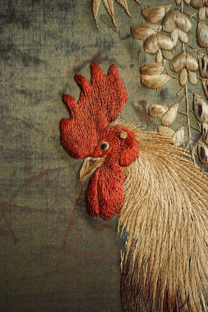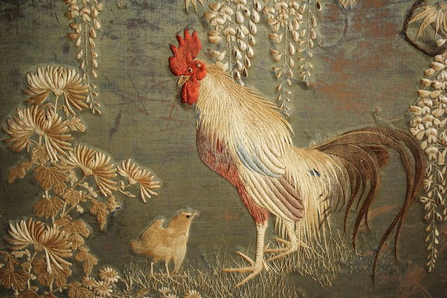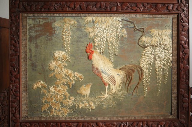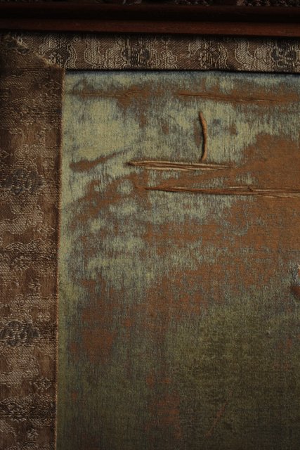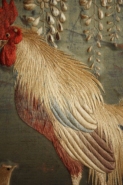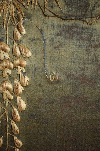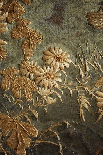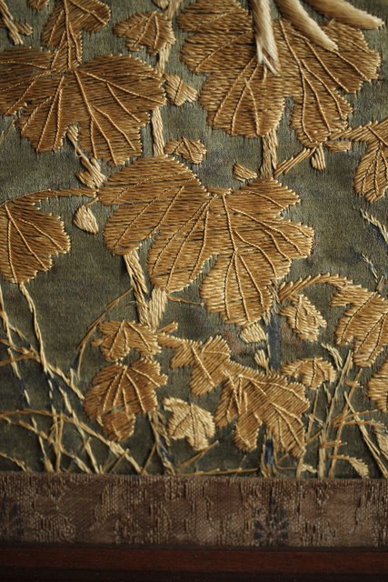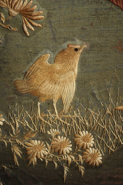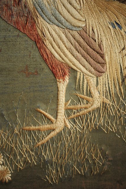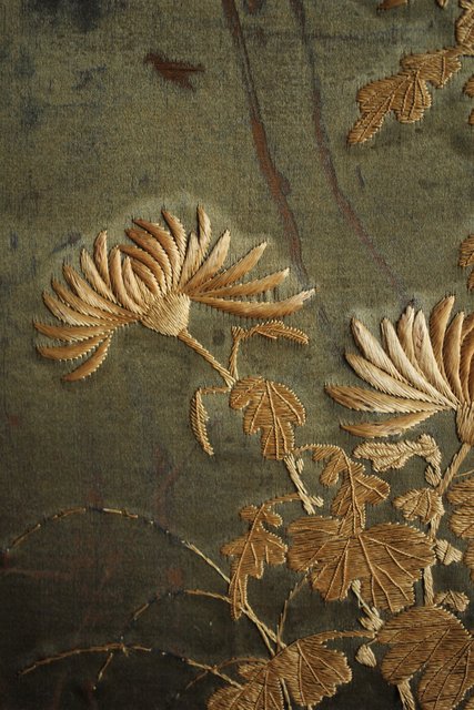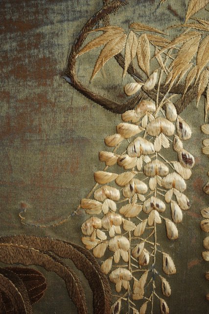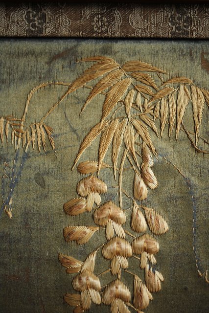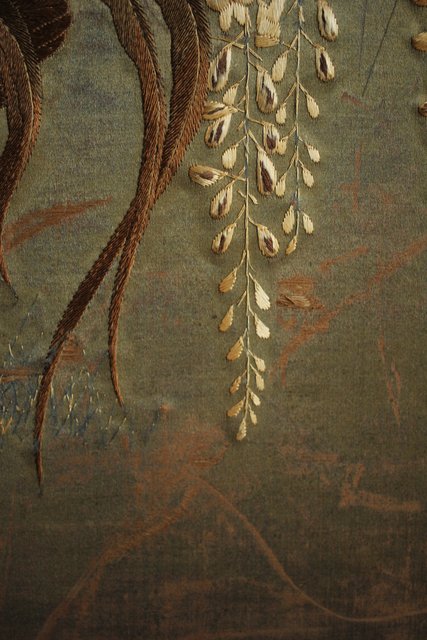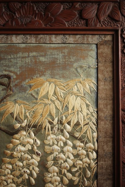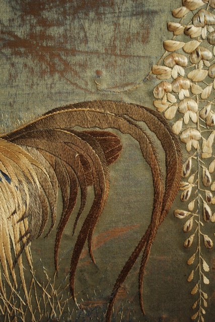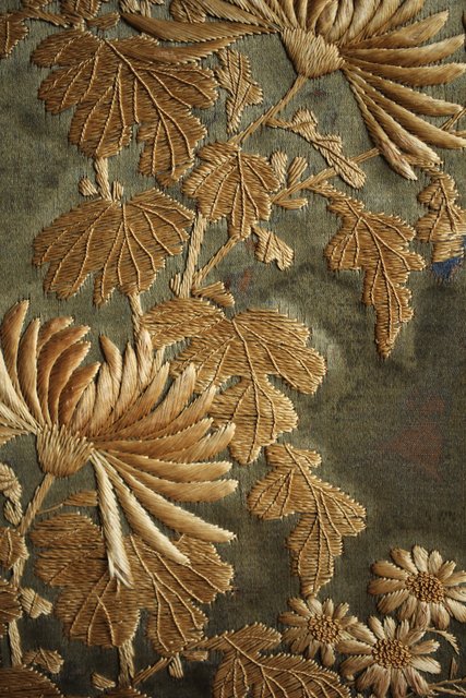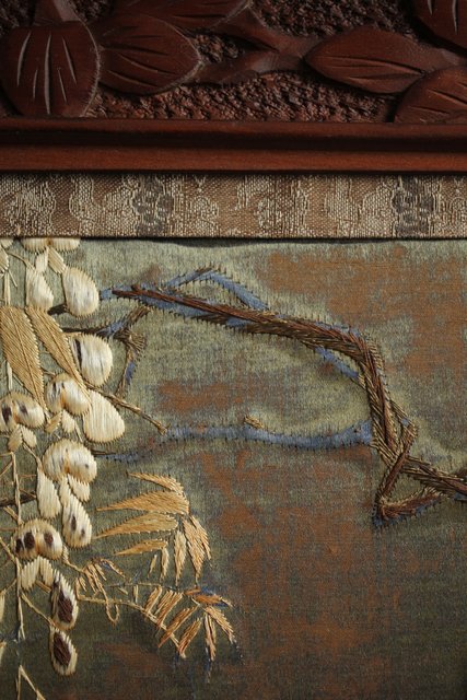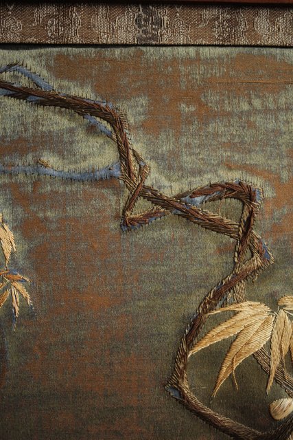 中央には見事な明治刺繍 素材のせいか光沢を感じる美しい時代工芸です