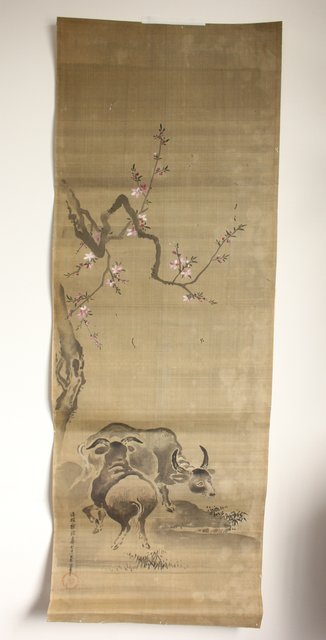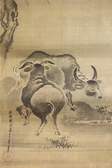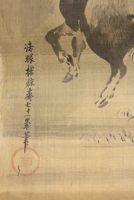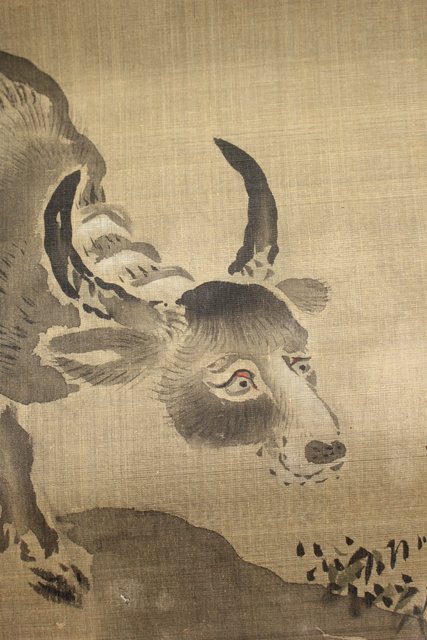 鶴澤探鯨 狩野派 まくり 彩色 絹本『牛』 Z076