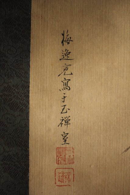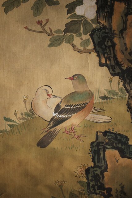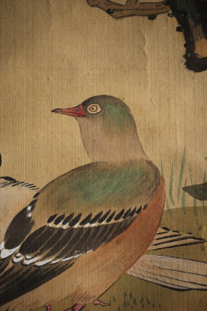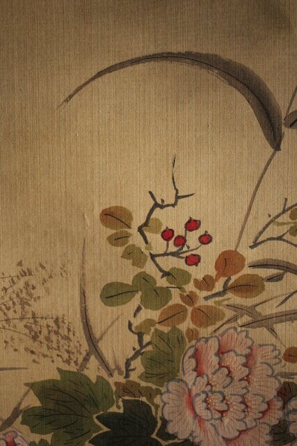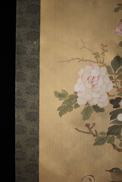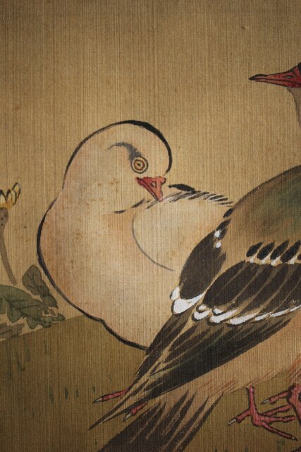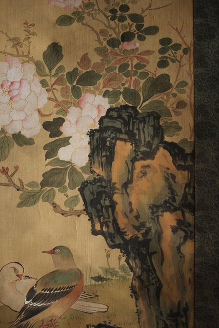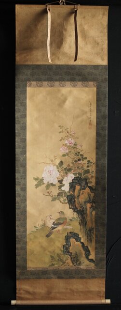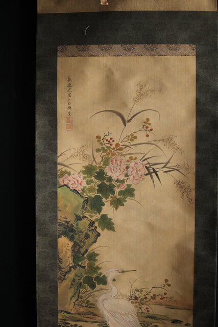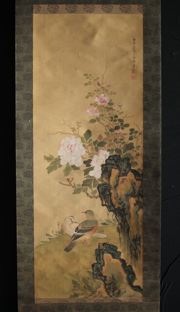 美しい花鳥図 細密な花鳥画を得意とした梅逸の印象が入った掛軸