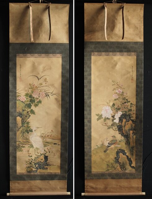 倣 山本梅逸 花鳥之図 双幅 絹本掛軸 Z225