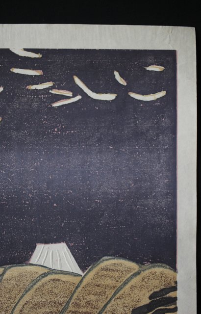 作品に雲母(きら)を使用し富士の冠雪を「きめこみ(空摺り)」を使用しているのが確認できます