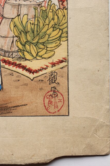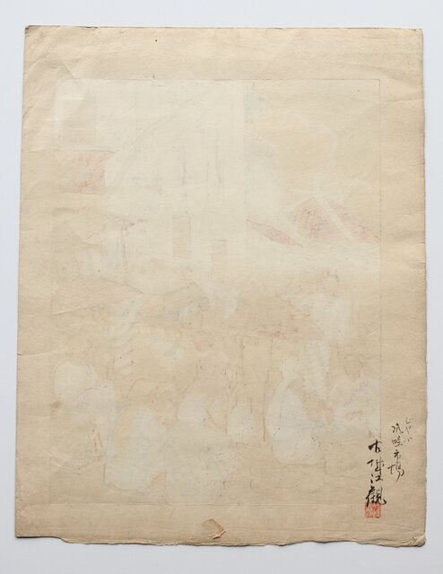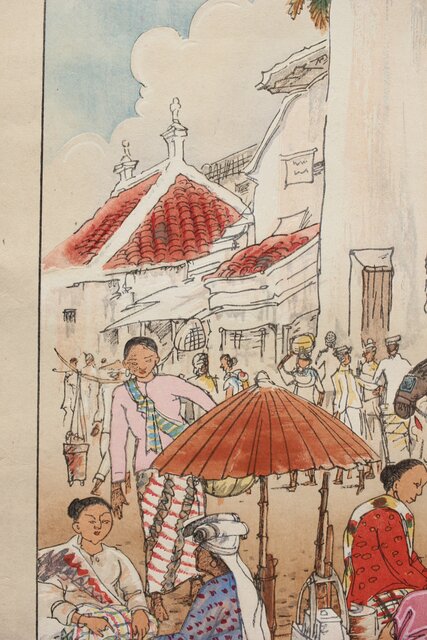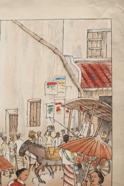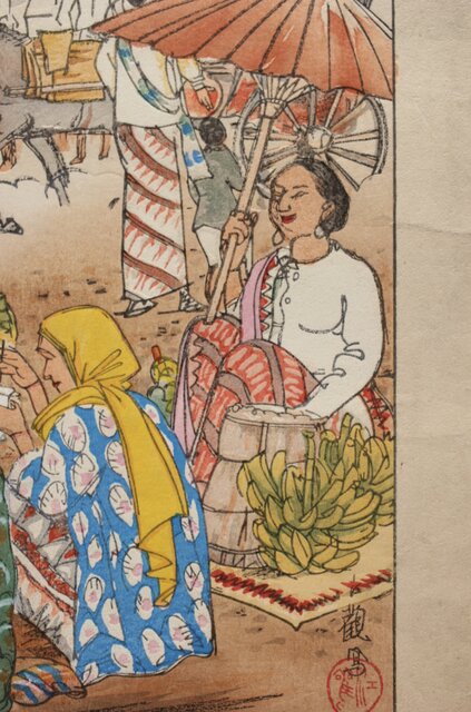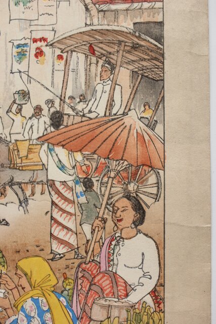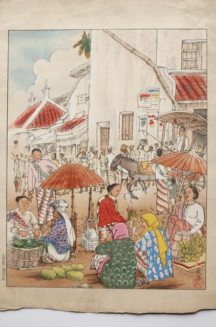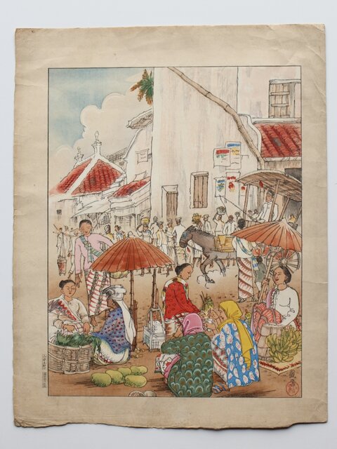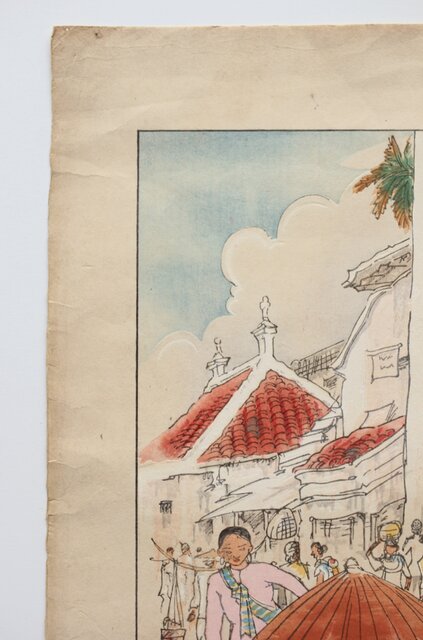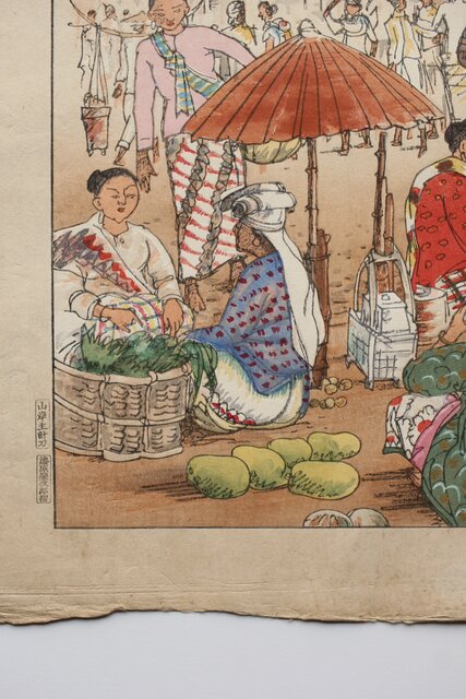古城江観 木版画 ジャワ市場風景 山岸主計刀 Z340