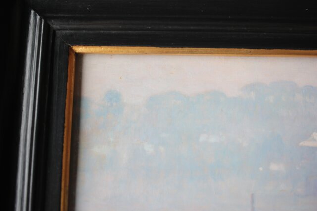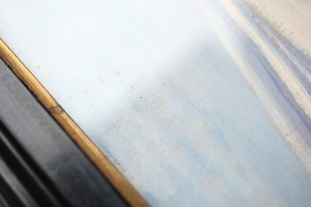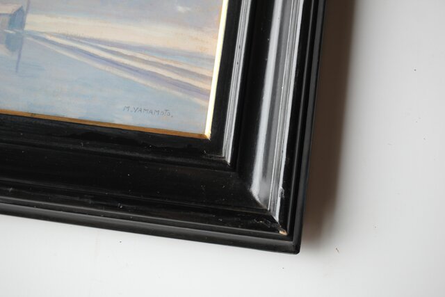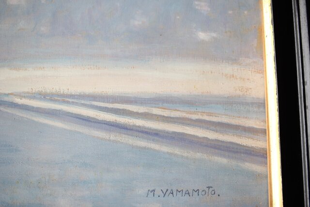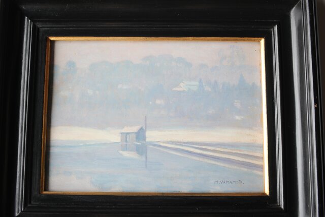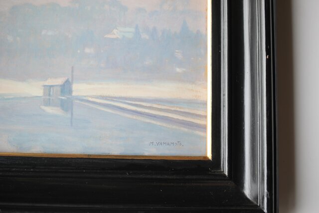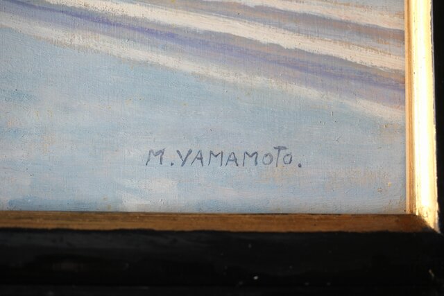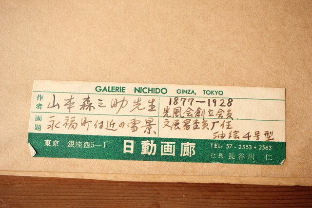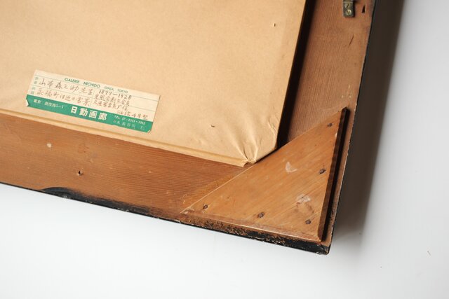 「M.YAMAMOTO」サイン 日動画廊シール ガラスにシミ等が目立ちます