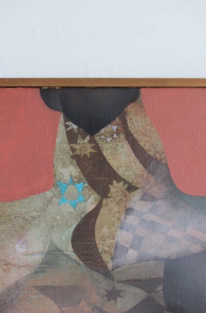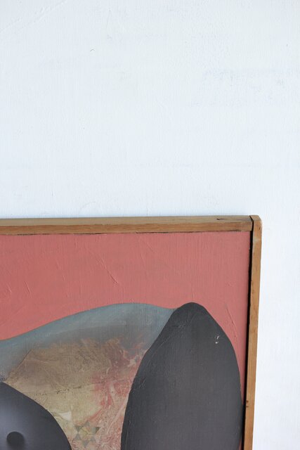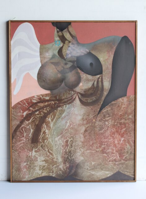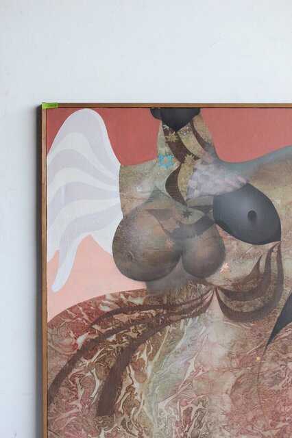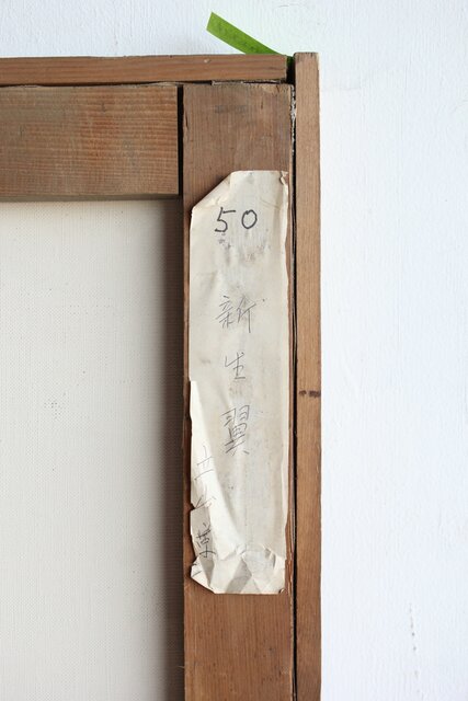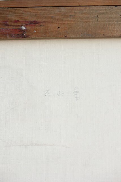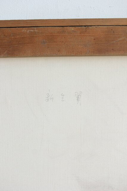 本作は所載 キャンバス地にミクストメディアのような多素材による作品とみられる