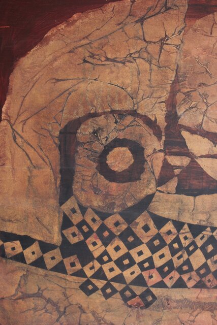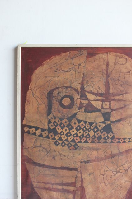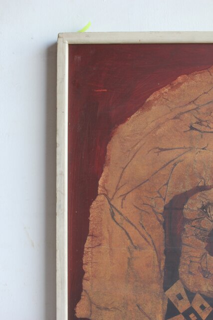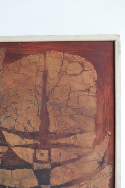 本作は所載 キャンバス地にミクストメディアのような多素材による作品とみられる