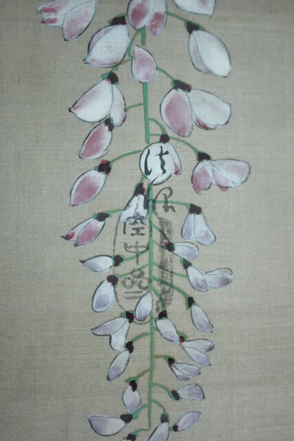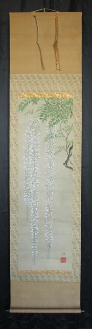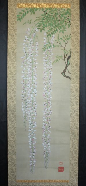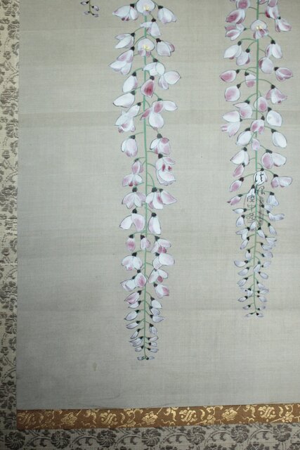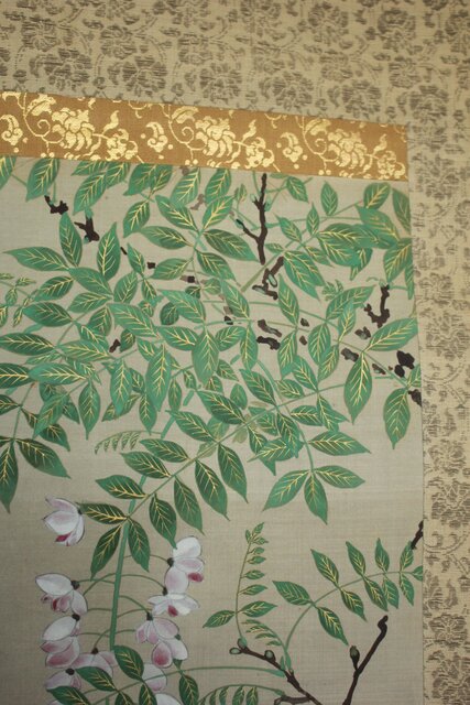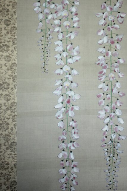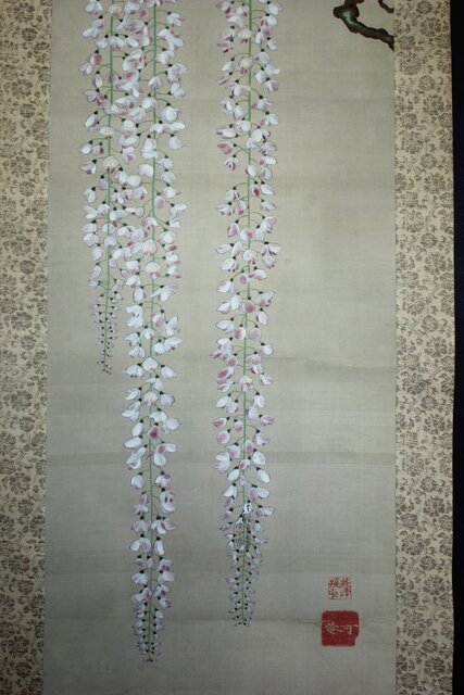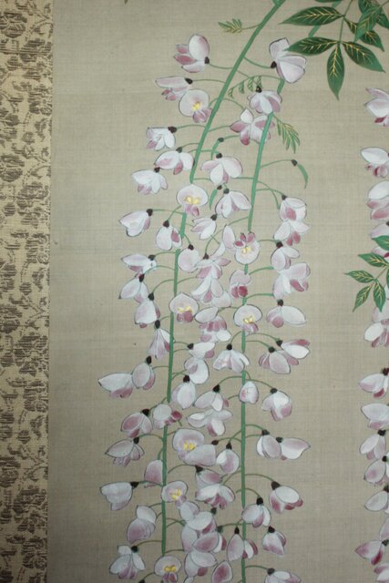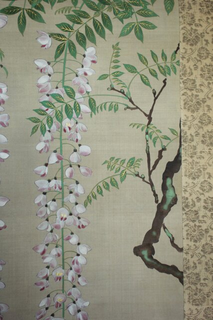 藤の房に顕著な縦長の画面を生かした構図 幹にほどこされた緑青のたらしこみ 花や葉の繊細な色感