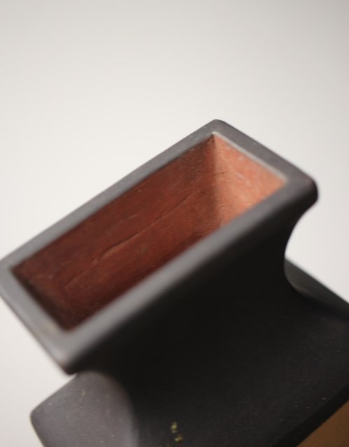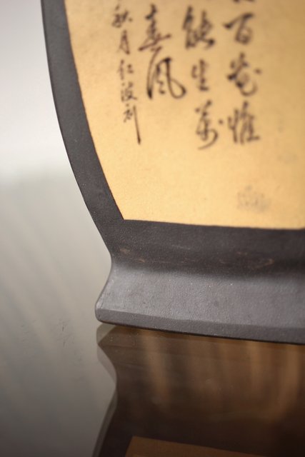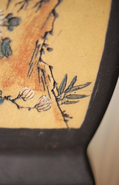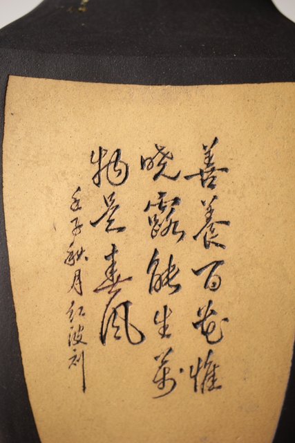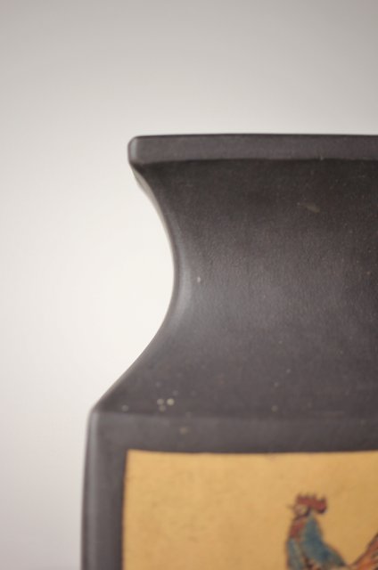 宜興紫砂 紅波刻 朱泥梅樹鳥釘彫漢詩文 四方花瓶 P244