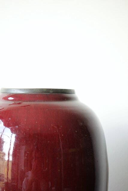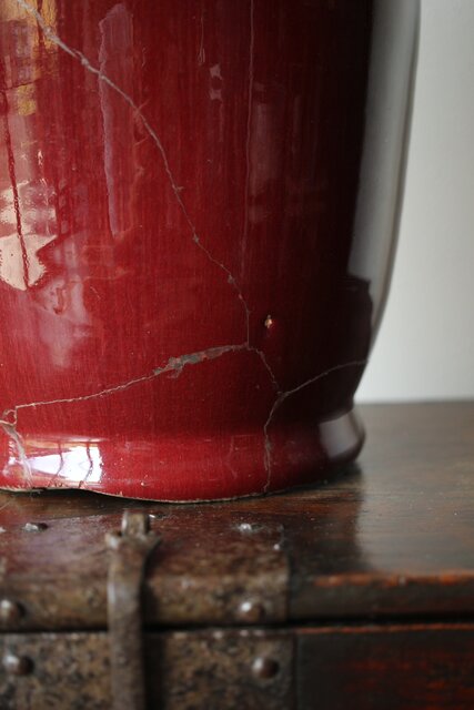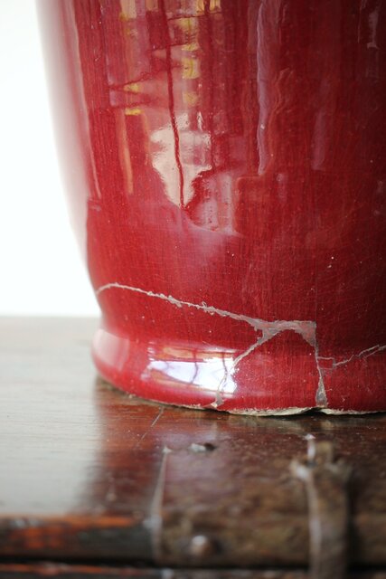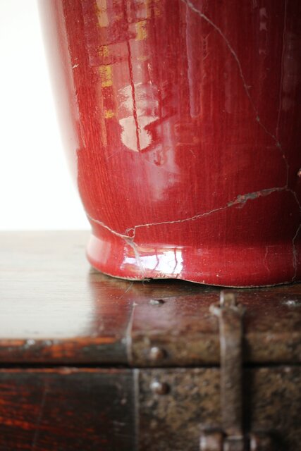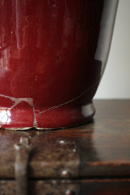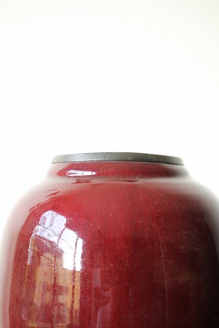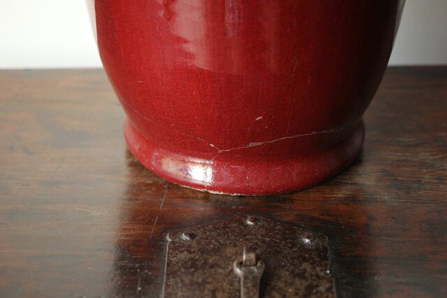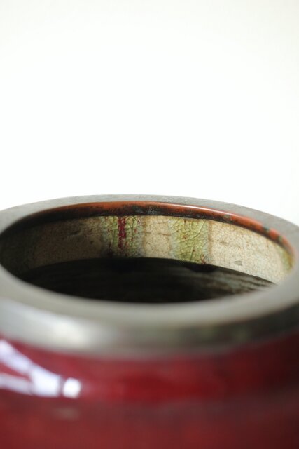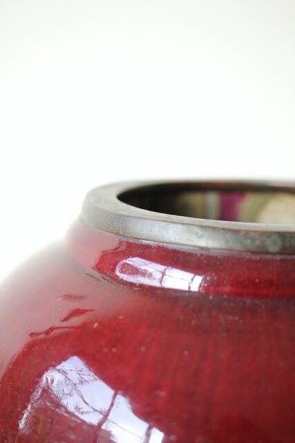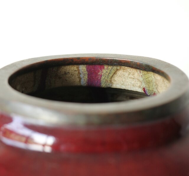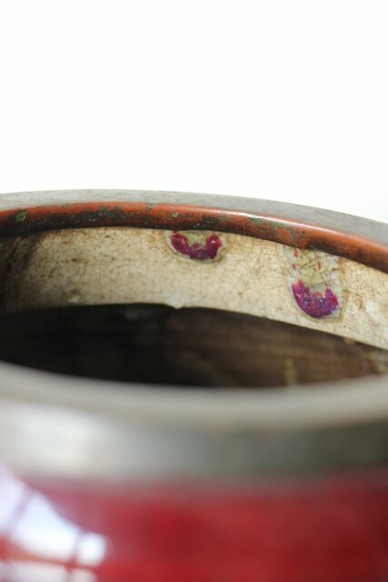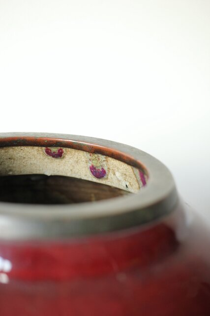 たっぷりと掛けられた紅釉は下部にたまることが多く 瓶を取り出す際にはぎとらなければいけない作業があった様子 こちらも例外ではなくかぶにたっぷりと溜まった釉薬ははぎとられています
