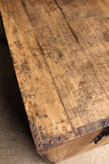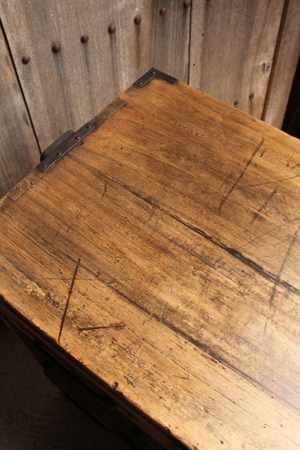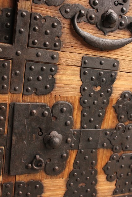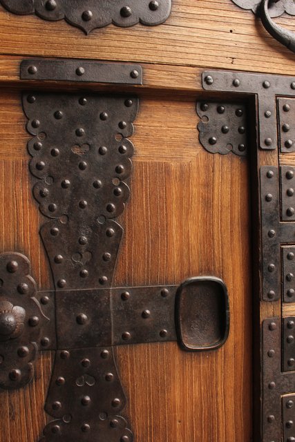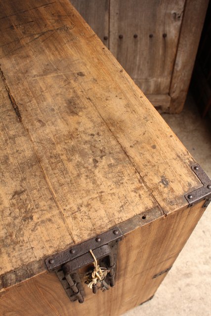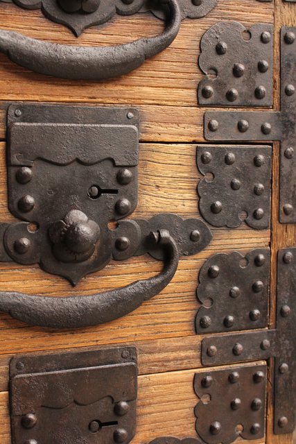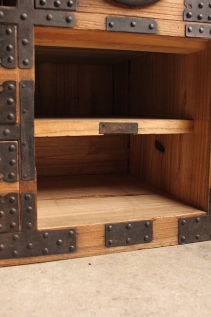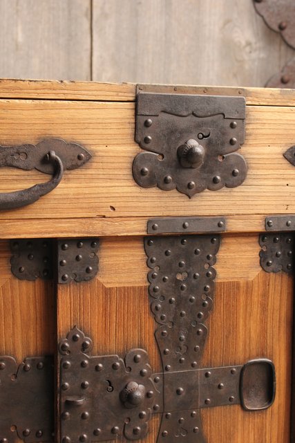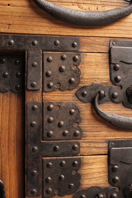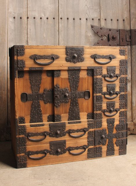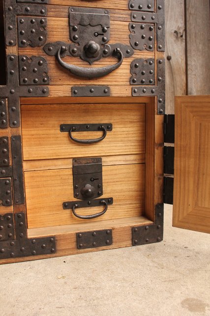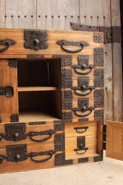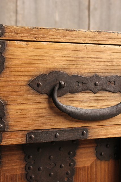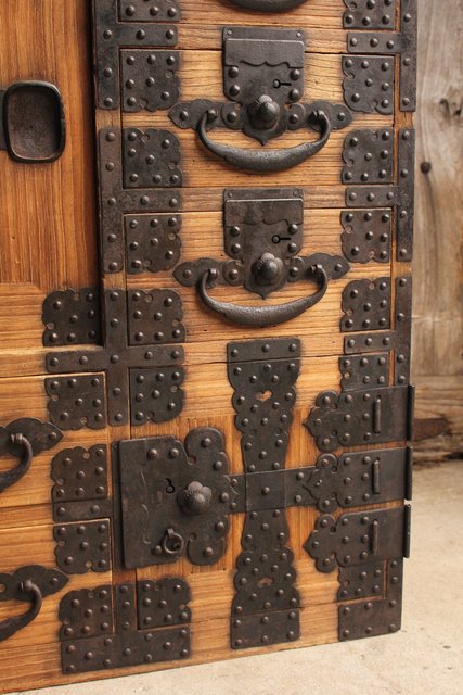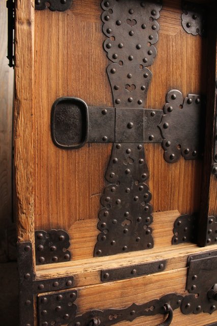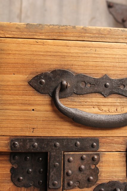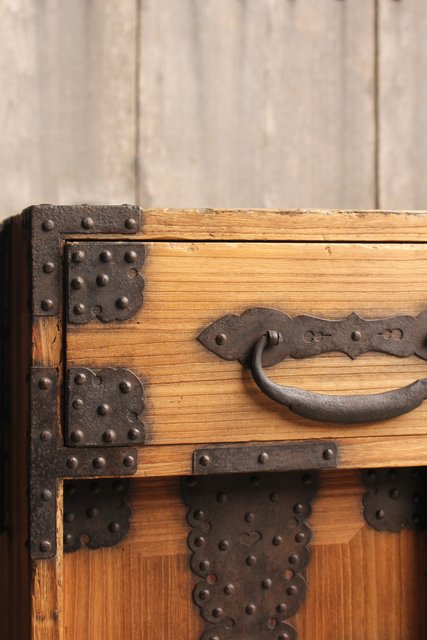金具が前面に張り巡らされた印象的な帳場箪笥