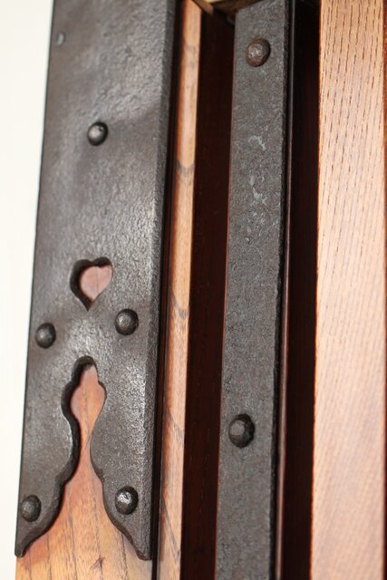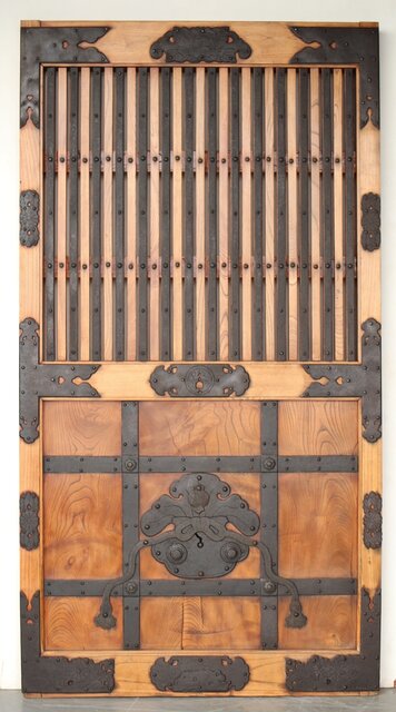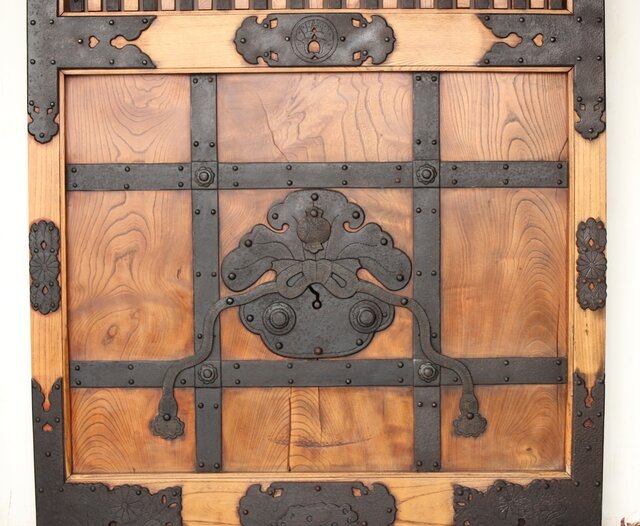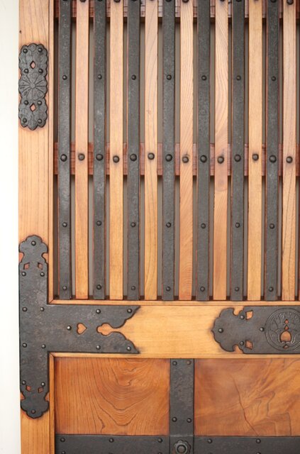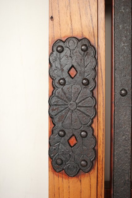総欅 重金具格子蔵戸 W114Y 彫金が施された部分も