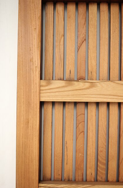 総欅 重金具格子蔵戸 W114Y 数センチ反っている様子