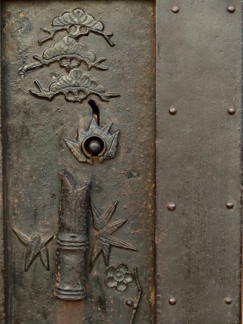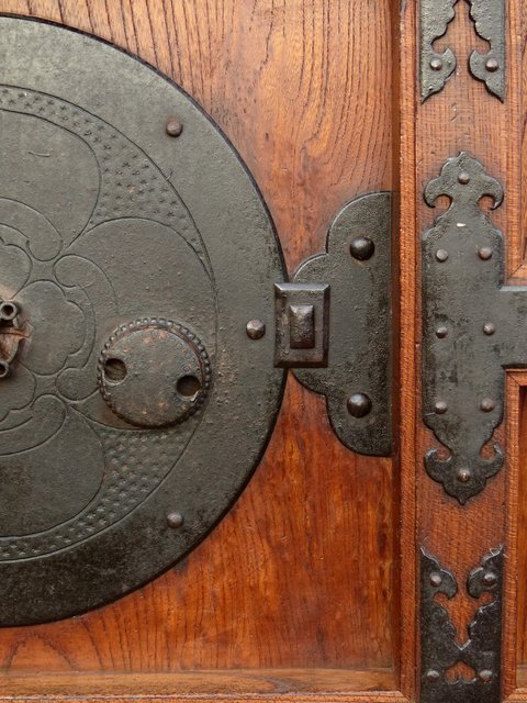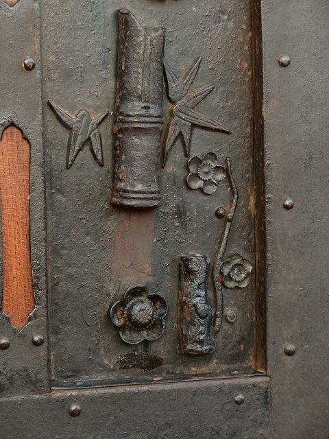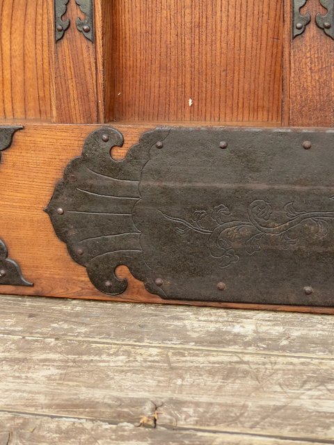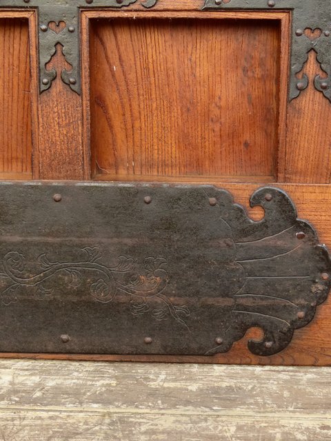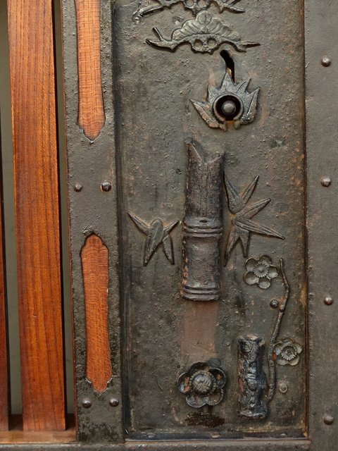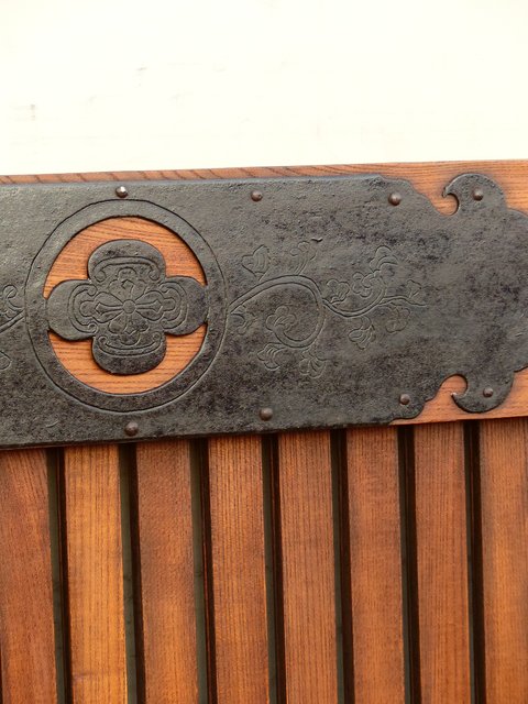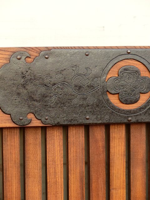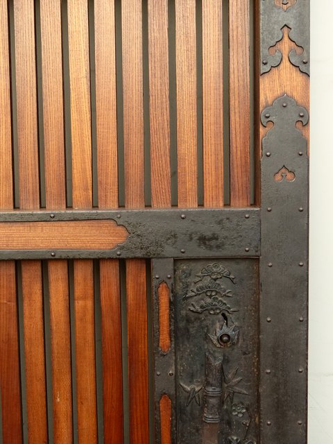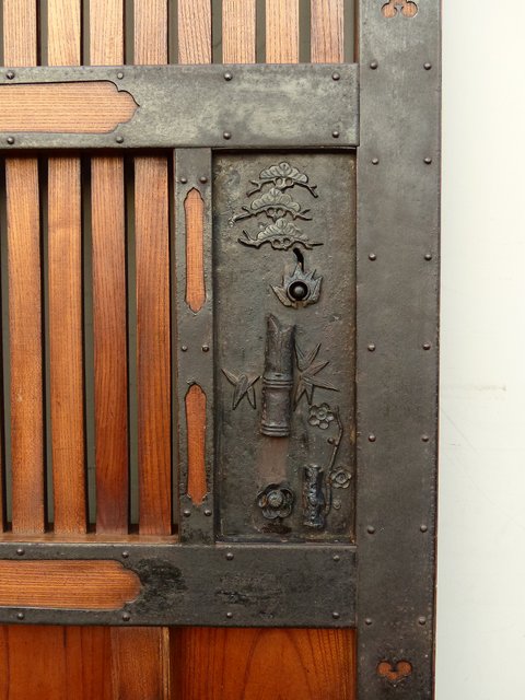 通常蔵戸の金具は打ち出しで激しく勢いのあるものが多い中 こちらの装飾金具はとても繊細