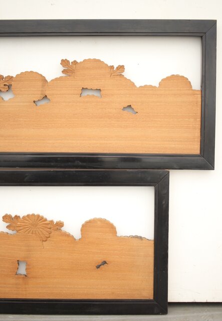 黒枠 菊彫欄間 2枚1組 R0010 かけている部分 全体としてそこまで目立たない様子