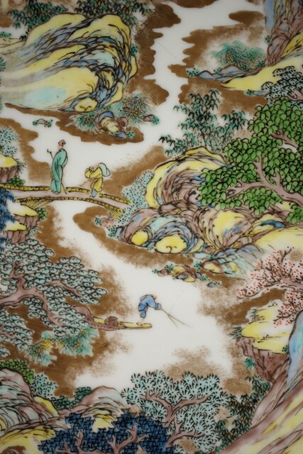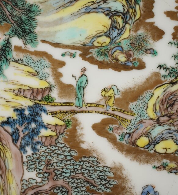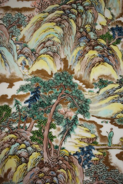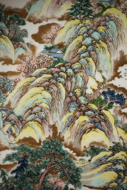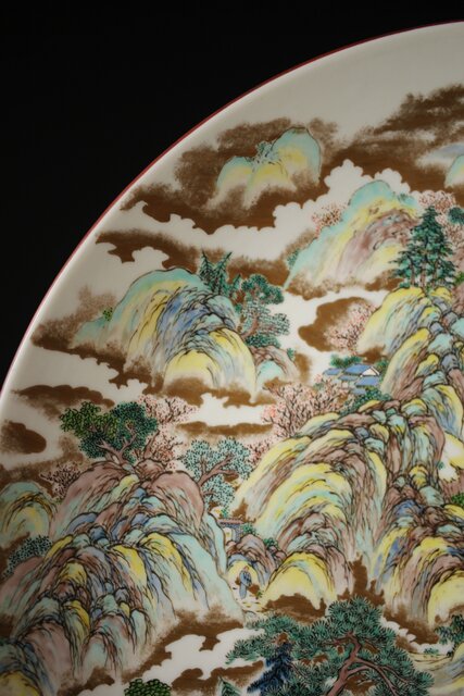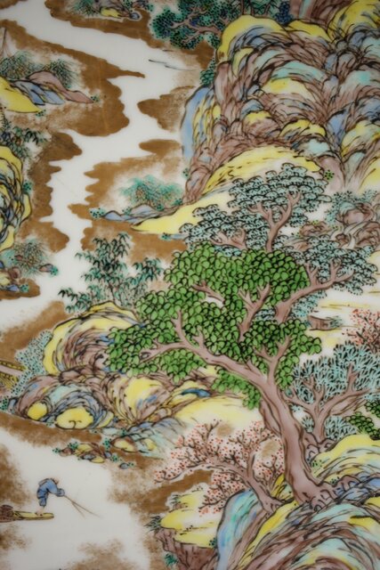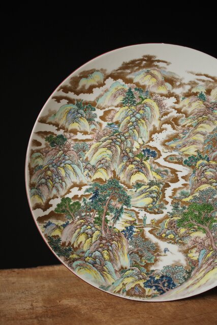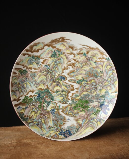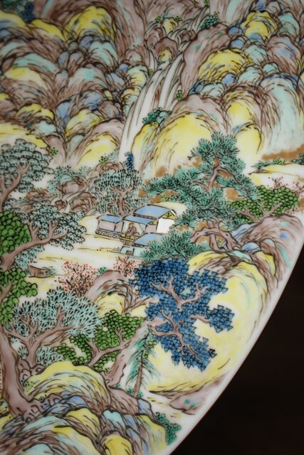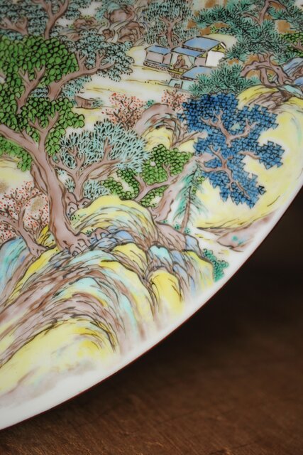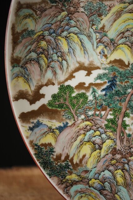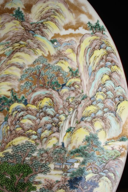 非常に技術のある掛軸の作家以上の見事な書き込み 九谷焼の色遣いが美しい見事な山水画です
