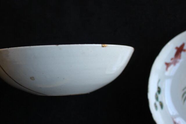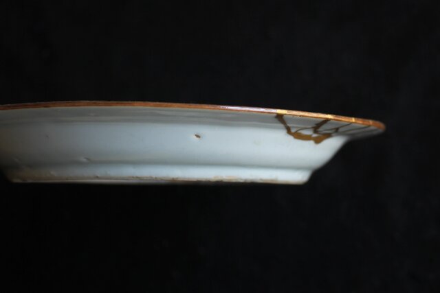 こちらも古九谷の定番変形皿ですが 縁に傷が多く見られ 漆の直しがあります
