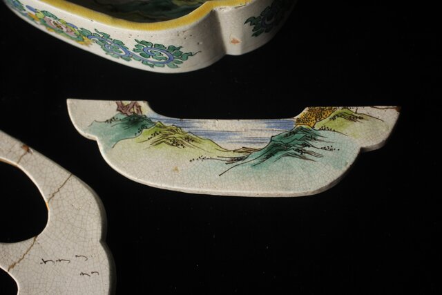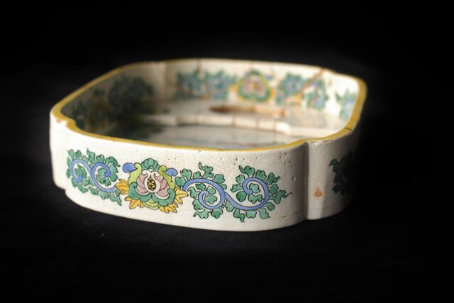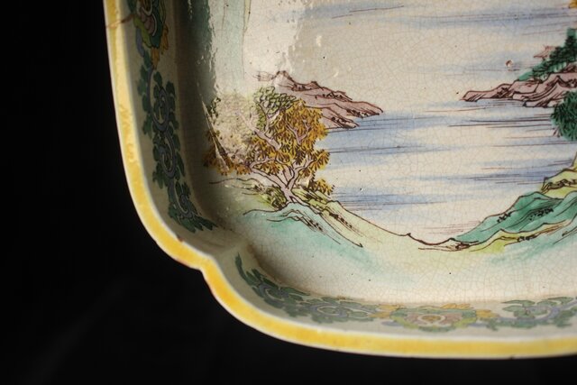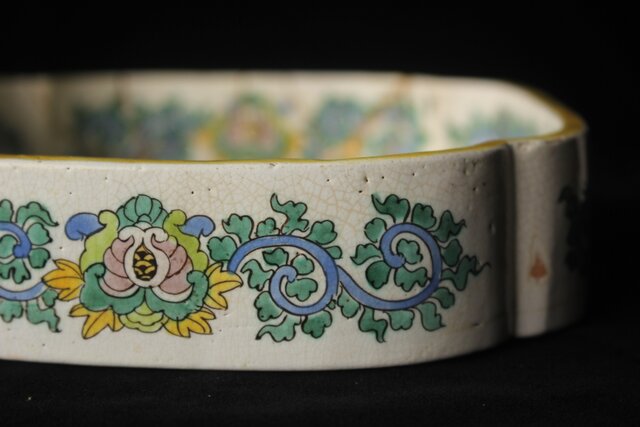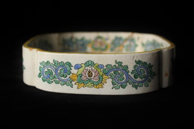 絵呉須で模様を骨措きし 青 鼠紫 黄 褐色の彩釉を施して焼成したものである